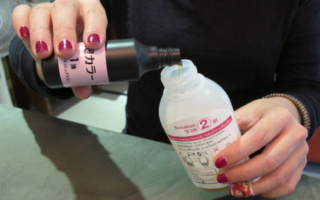 先將黑色瓶身的第一劑緩緩倒入白瓶身的第二劑混合,再上下180度慢慢來回翻轉瓶身約五次,不可以像搖泡沫紅茶般快速用力搖晃瓶身,若瓶子內產生泡泡,換上噴嘴後泡沫會不易擠出喔!接著戴上手套,輕輕按壓瓶身,泡沫就出來囉~染髮DIY開始!