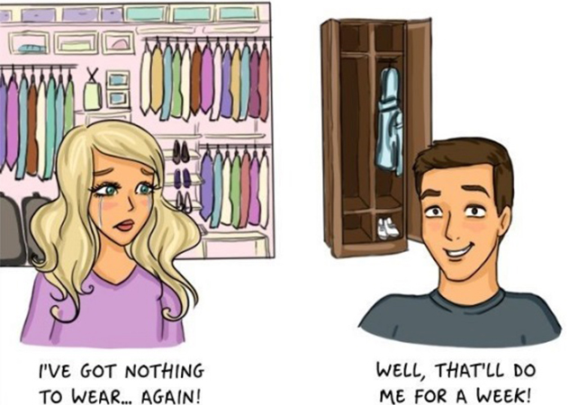 男生跟女生真的是來自兩個不同世界的動物,除了生理構造不同外,想法、生活習慣、消費模式也是天差地遠!國外網站Brightside的插畫,以幽默又風趣的方式寫實呈現出我們的差別,相信大家看完都會會心一笑,而且還會發現我們好像真的就是如此!圖片/Web