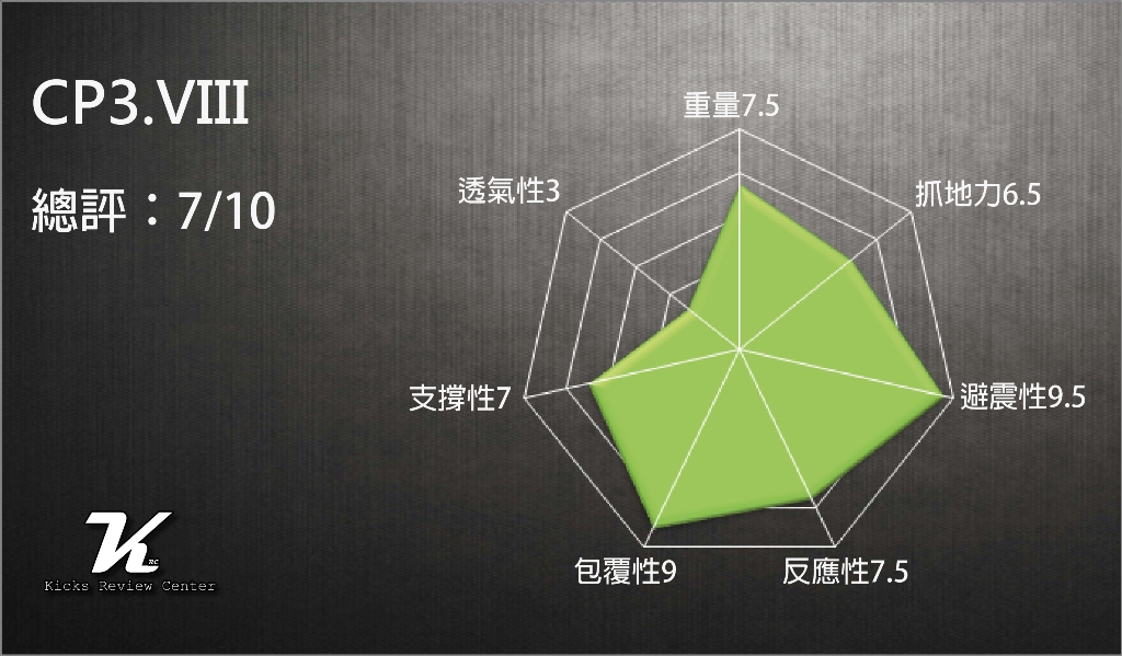 本年度筆者測試鞋款中,CP3.VIII 擁有排名前段班的避震表現,前腳掌 Zoom Air 搭配後腳掌 Lunarlon 的配置不論在穿著舒適度與實際緩震測試皆非常突出;但抓地力、透氣性表現卻是數一數二糟糕,必須不時清潔鞋底沙塵,才能維持一定程度的抓地力,非常不適合在任何室外場地穿著。綜觀上列七個測試項目,本次測試的 8 代綜合表現並無 6 代、7 代來的令人驚豔、優秀。