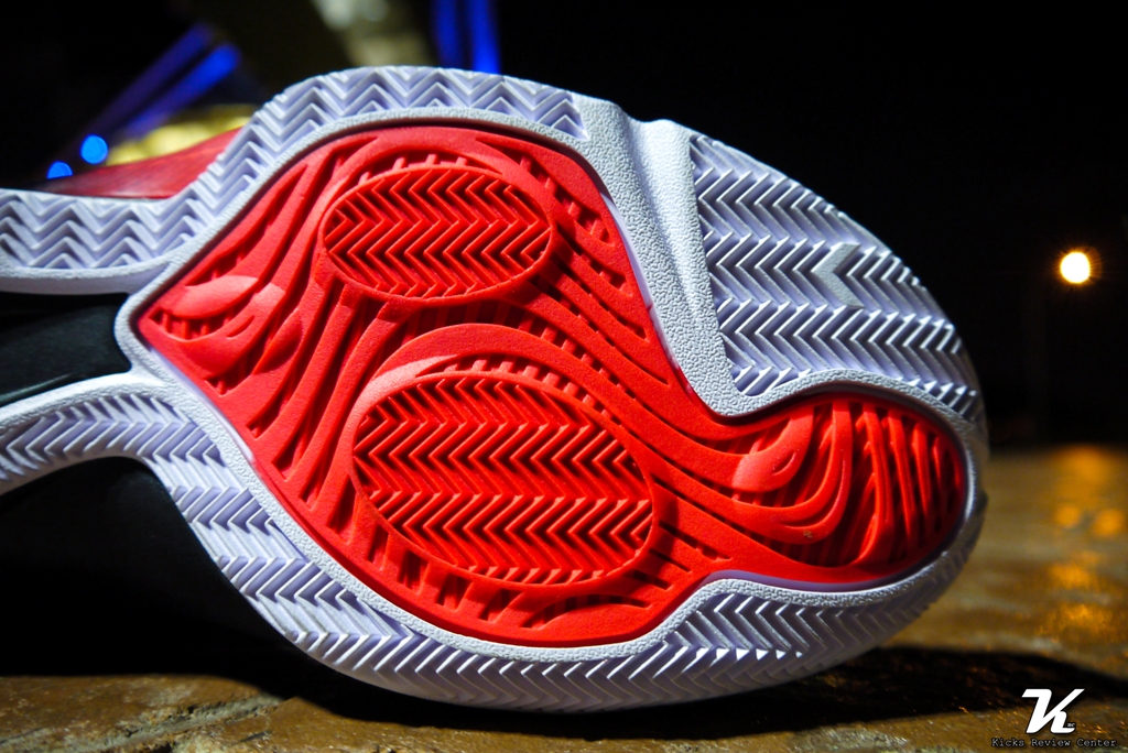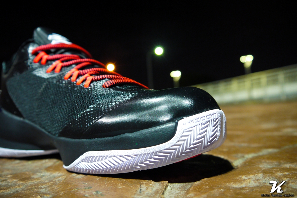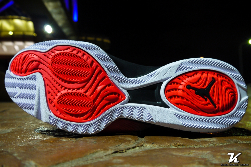 CP3.VIII 外底分為兩個區塊,外圍區域(本配色為白色處)採用魚骨紋路;中間核心區域(本配色為橘紅色處)主要採用與 JORDAN SUPER.FLY 3 相同的波浪型紋路,並於前腳掌外底 pods (即兩個圓形區域)添加些許魚骨紋路。一般而言,球鞋外底只要採用魚骨紋路,雖然外觀較無特色,但抓地力皆有水準以上的表現。但 CP3.VIII 卻大大跌破筆者的眼鏡,測試時,不論室內、室外水泥、室外 PU 場地,皆會有滑動的情形,尤其沙塵較多的室外場地更為嚴重。若與前代 CP3.VII 相比,抓地力表現遜色不少。筆者認為造成抓地力不佳的最大因素在於外底中間核心區域波浪型紋路與紋路之間的空隙過大,且 pods 的魚骨紋路面積過小,造成無法有效產生抓地力。