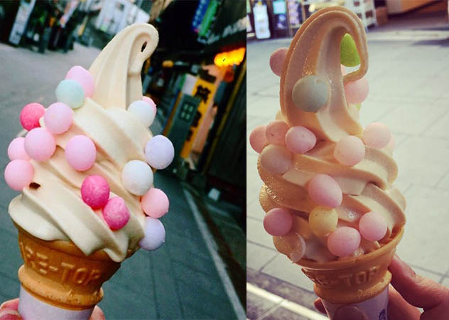 大家是不是很好奇彩球吃起來是什麼口感呢?它吃起來脆脆的,吃進嘴裡馬上就會化開,就像是在吃細砂糖一樣,跟著冰淇淋一起吃剛好可以平衡彩球的甜度。美味的冰淇淋搭配上可愛的造型,難怪會成為日本妹新寵!