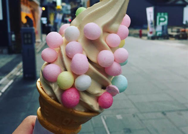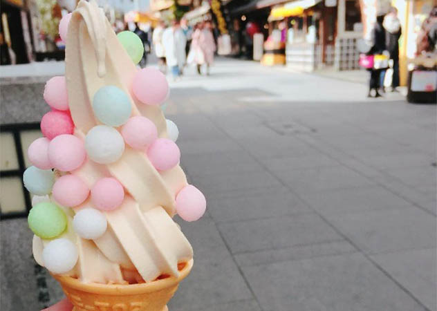 因為冰淇淋上頭布滿的彩球就是「おいり」,這是香川特產的菓子,而且是新娘必備的嫁妝之一,代表新娘子嫁到夫家,會全心全意奉獻。冰淇淋口味有鮮奶、醬油、蕃薯、綜合與香川縣特產黑砂糖-三盆,當你選好口味後,老闆就會幫你撒上繽紛的彩球囉~