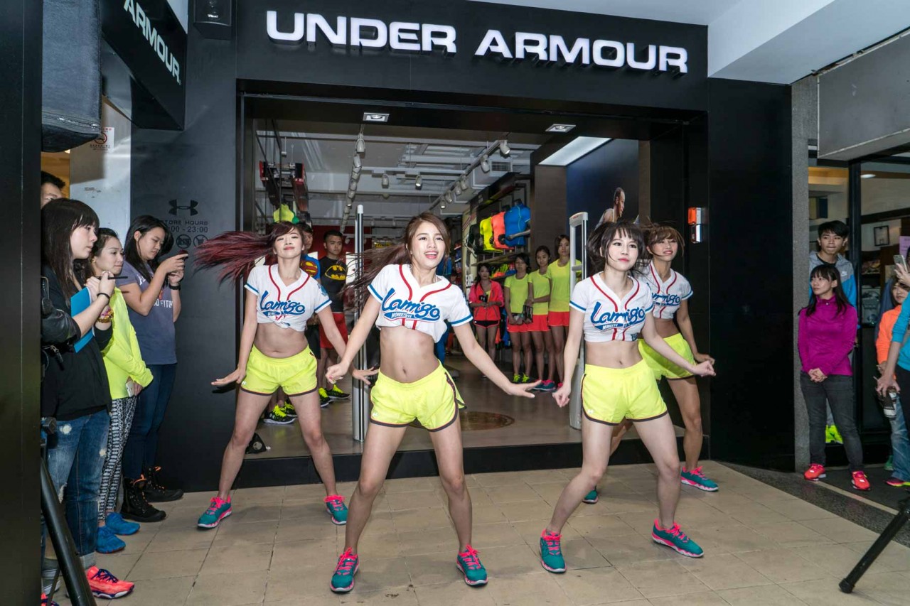 開幕活動現場邀請極限體能王知名選手李恩至還有桃猿的啦啦隊 Lamigirls 與街頭健身團體一同出席,Under Armour 在對運動產品需求非常大的逢甲商圈獻上了與品牌形象非常符合的開場表演,不論是啦啦隊的活力舞蹈還是由李恩至領銜的許多展現體能的演出,都讓現場的氣氛隨之高漲,Under Armour 現在是桃猿隊的贊助商,因此在很多的活動中都能看到 Lamigirls 出席相挺。