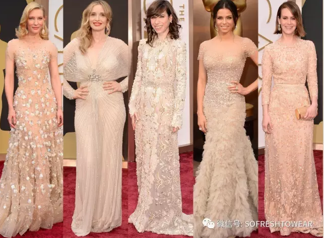 再來看看Oscar頒獎典禮上,雖然大家也穿的很美麗,但在顏色上選擇相對保守。大家那年有志一同選了裸色。