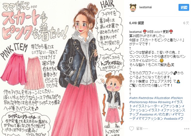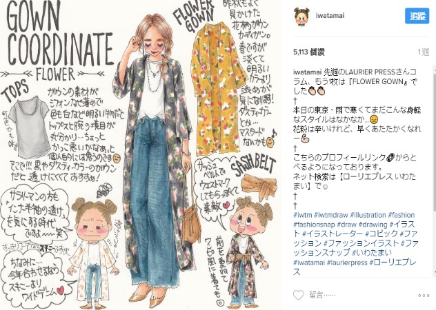 本來就是插畫家的她,在IG上面擁有眾多粉絲的支持。畫風可愛,裡面選搭的衣服都是一般女生衣櫃會有的,可以輕鬆打造不同的日常LOOK。而且還會很貼心的寫講解,做的就跟雜誌一樣(可惜小編看不懂日文阿~)