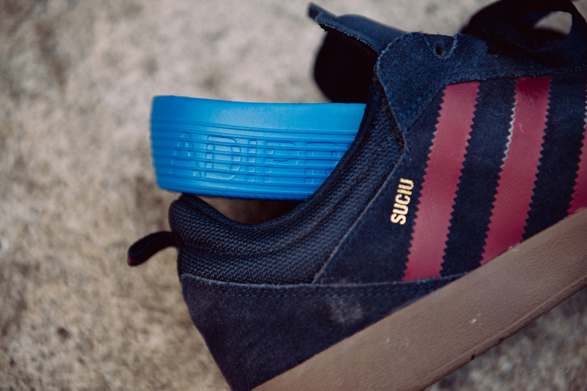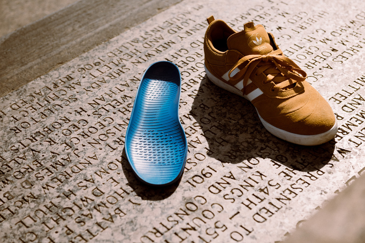 不同於其他人,Mark Suciu 本身也對設計鞋款很有興趣,這次可分離式 adiprene 鞋墊就是來自他的發想,而這位 23 歲的滑板選手本身也對歐洲哥德式建築相當有興趣,強調華麗、堂皇,圓頂式建築都是這類建築的特色之一,他也把這些想法運用到鞋款上,鞋後跟的線條呈現圓弧與俐落分割的特色;在鞋舌上也可以看到相同輪廓,而其上面的字樣也運用了中古世紀書寫體的樣式,展現了這位滑板選手異於常人的巧思。