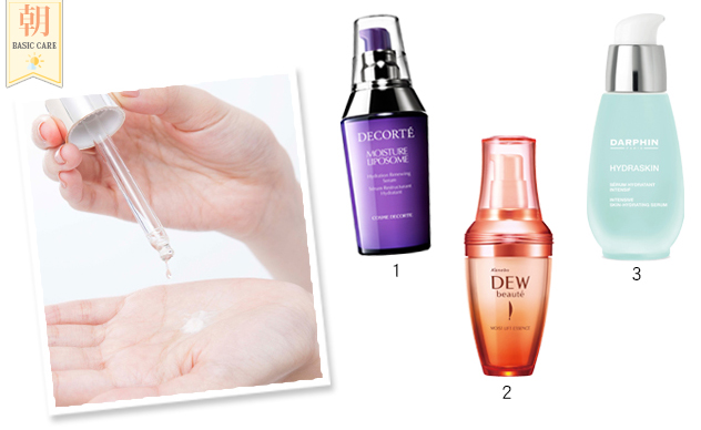 洗臉化妝水後就要使用精華液。使用適量塗於整臉肌膚,在容易乾燥的眼周、鼻翼、兩頰等部位再多塗幾層。