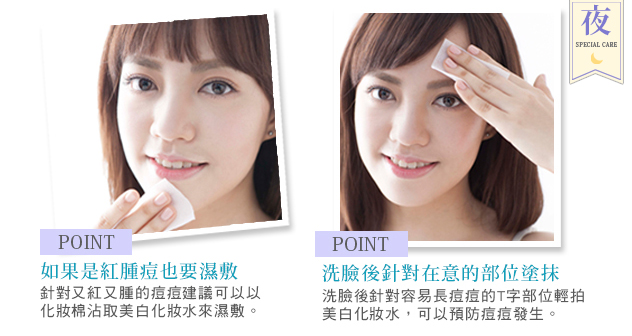 Technique2在意臉部的痘痘時可使用美白化妝水濕敷!