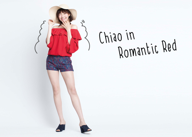 glimmer 紅色露肩荷葉邊上衣/NT$9,800、glimmer 粗呢短褲/NT$9,680、Sophie&Sam 藍色交叉帶魚口跟鞋/NT$1,280、Accessories 米色寬延帽/NT$1,175