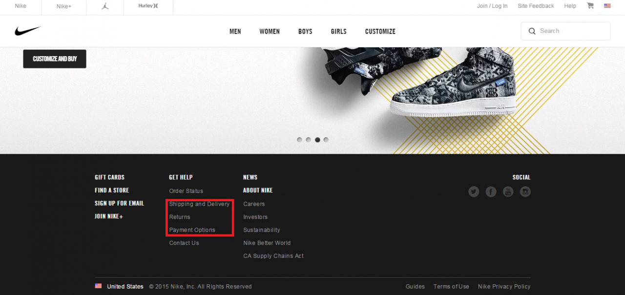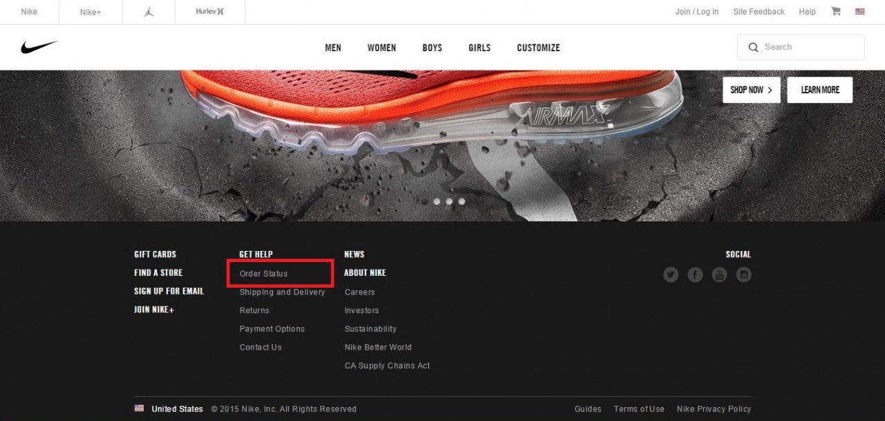 ●美國請在首頁下方 GET HELP 中紅框所標示選項擇一點選,網頁跳轉後就有線上客服。