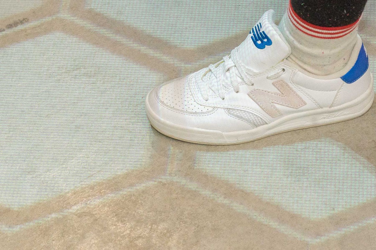 各位勘履者對對於我們近期 Fresh Foam 跑鞋評測不曉得是否還有印象?依照這個 new balance 的蜂窩形狀為靈感,各位勘履者別錯過在入口處依此為靈感的互動裝置,天花板有裝置會感應到從門口入內的步伐,順著地面的六角形投影前進就可來到陳列架前。