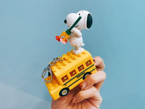 史努比學校巴士款,上方的史努比為積木公仔系列額外加裝上去,特別的積木設計可以自己組裝特色吊飾。