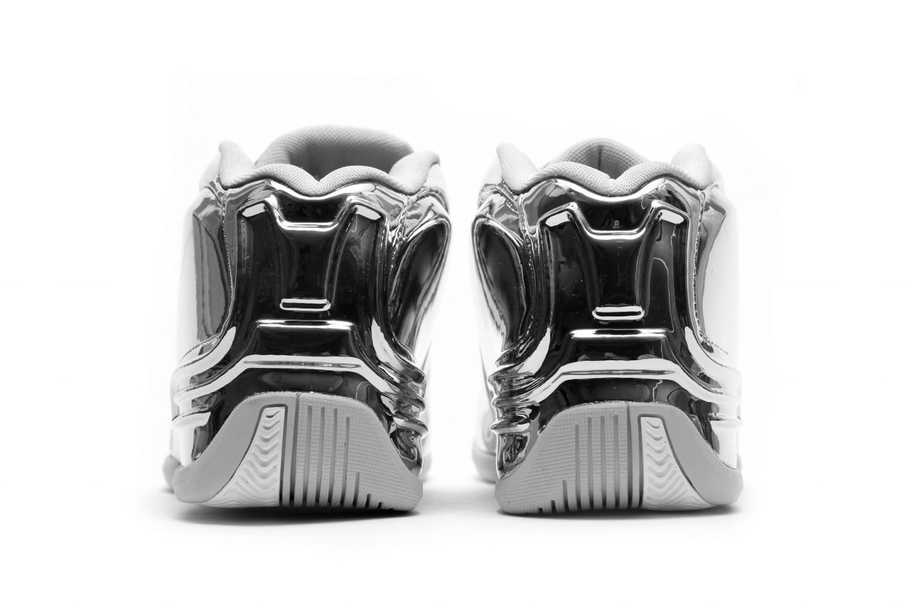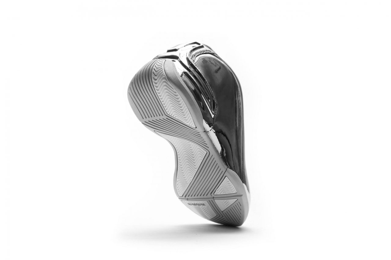 簡單外型搭配誇張的亮銀色,鞋面外側有著大面積 TPU 射出片,採用電流將電鍍液塗上,並在準確的溫度和時間掌控下,完成電鍍鞋面。鞋身上每一個細節都經過先進的電鍍工藝打磨,盡顯搶眼風采。本次復刻除了打造輕量化鞋底,更加入耐磨橡膠顆粒設計,大幅提升抓地力及速度感。