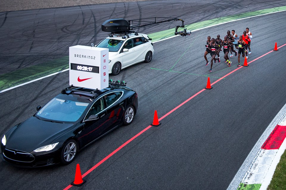 這次挑戰,配速意味著一切。為了時刻提醒 Eliud Kipchoge、Zersenay Tadese 和 Lelisa Desisa 達到 1 小時 59 分 59 秒的目標所需要保持的配速,一輛電動車(不會排出廢氣)在運動員和配速員 6 公尺前領跑,顯示當前配速、當前耗時以及預期的完賽時間。身為 Nike 運動研究實驗室研究員和首席生理學家 Dr.Brett Kirby 表示「這對於公路跑來說很常見,只是 Breaking2 的領跑車會在每 200 公尺進行一次提示而其它比賽是在每 1 公里或 5 公里才會提醒一次。」