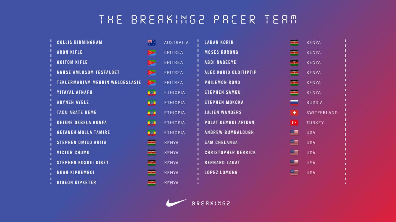 為了突破馬拉松 2 小時大關,運動員的配速不允許比所需配速慢一絲一毫。為此,一支由 30 個配速員組成的團隊 (由世界頂級長跑運動員組成,其中包括 Bernard Lagat) 輔助三位運動員保持破2的配速並形成一道擋風的屏障。配速員的選拔基於運動員的跑步能力和風格。和Dr.Brett Kirby 共同負責 Breaking2 日常科研工作的 Nike 運動研究實驗室探索研究團隊新產品總監 Dr. Brad Wilkins 說道「我們需要的是穩定的,能夠維持同樣速度的跑者。」