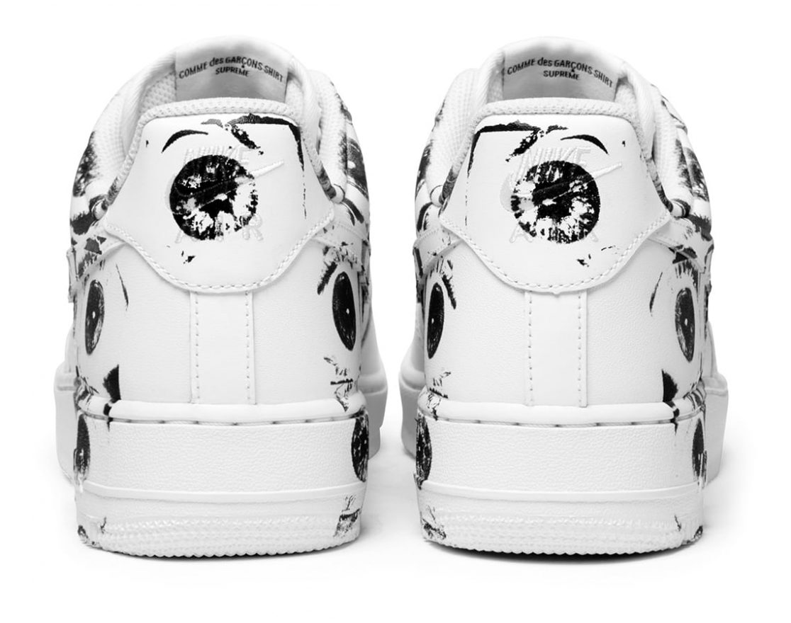 此番聯名在經典的全白 Air Force 1 上大作文章,鞋子中後段採用類似塗鴉的手法印製上眼球圖案 (背後靈感可參閱友站 KEEDAN 的報導),兼具了藝術感和街頭風。Supreme x Comme des Garçons x Nike Air Force 1 依照地區分為兩階段開售,分別為 5 月 18 號(歐洲、美國) 和 5 月 20 號(日本)。值得注意的是,本次歐美地區僅開放線上購買,日本方面則是線上及實體店面皆會販售。