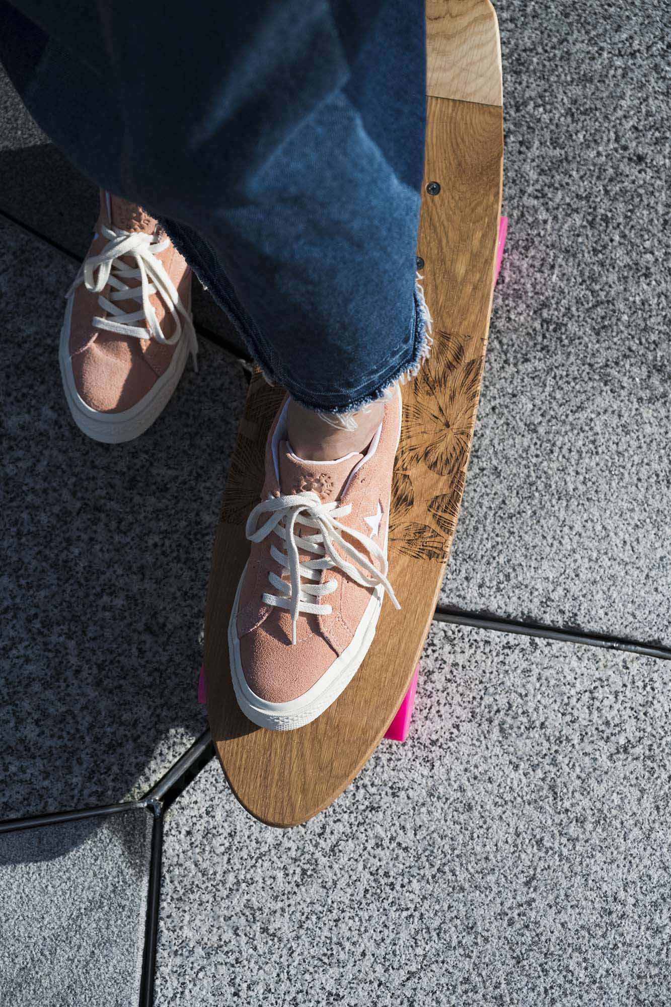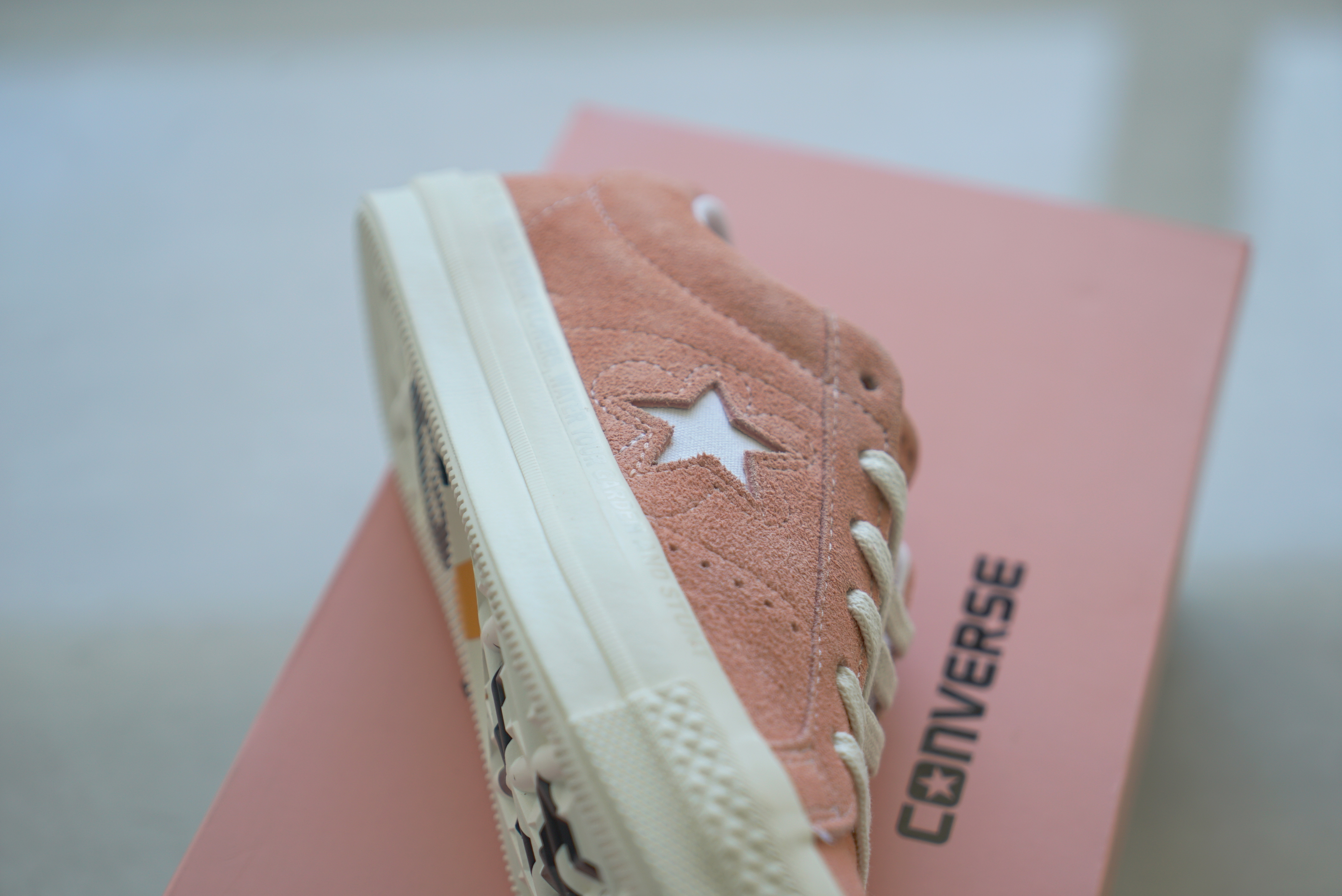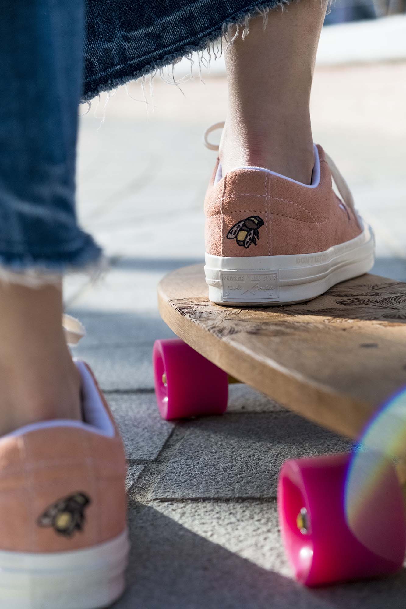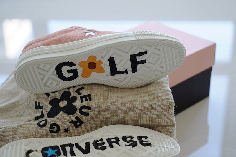 收到後打開鞋盒的那瞬間,就知道這次的 One Star x Golf le Fleur 沒有辜負大眾的期望。首先是隨鞋盒附上的收納麻布袋,材質厚實且不忘印上這次的聯名圖騰,接著細覽高質感麂皮的鞋身,除了圍繞著星號周圍的花朵縫線外,腳後跟的蜜蜂刺繡、鞋舌上的壓花 Golf le Fleur 標誌,甚至是印有彩繪字樣及設計的鞋墊,處處都是 Tyler, the Creator 鬼點子的化身。尤其是外底上的印刷字樣「Don’t let em kill your flowers,Water your garden and sunt」(別讓他們殺死你的花朵,替你的花園澆水和炫耀)更是需要用心留意才能發現到的細節,也代表著 Tyler, the Creator 想藏下的訊息。這次無論是天藍、桃粉、硫磺或紫羅蘭等多彩配色,還是反映著各種鬼點子的精緻設計都讓人相當上癮,想要好好地反覆欣賞,就怕錯過什麼精彩細節啊!台灣地區預計販售此系列女段部分,並將於 8/4 起在 Converse 指定店舖販售。