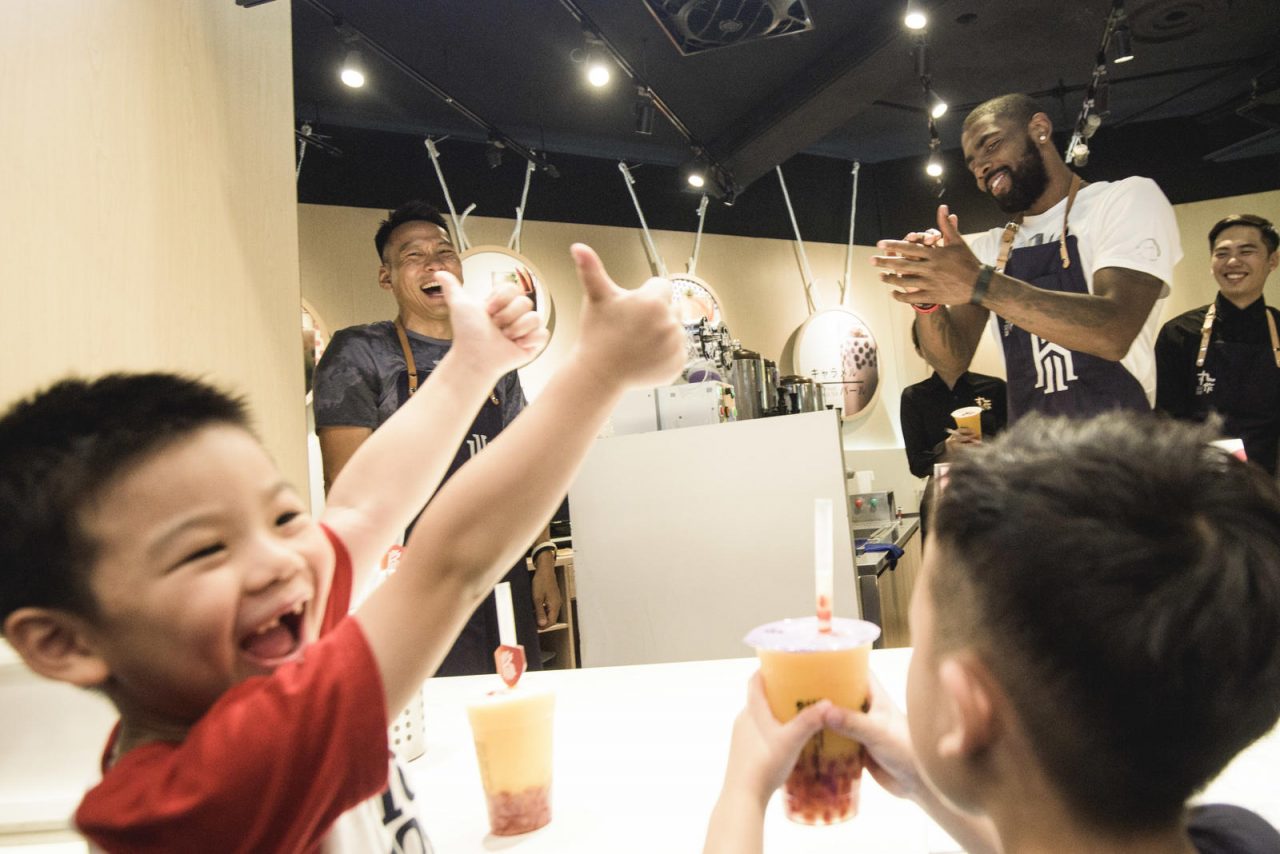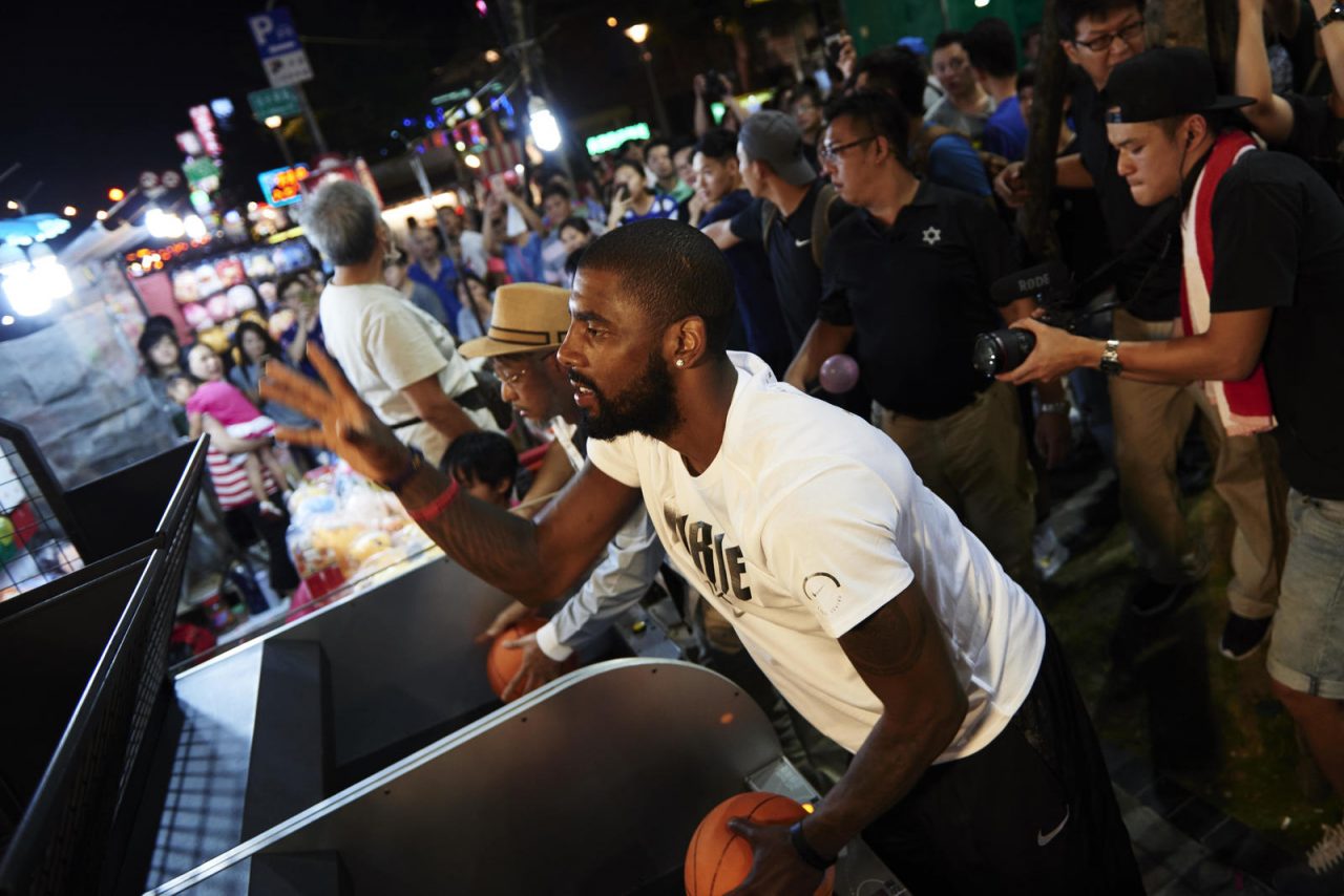 雖然僅短暫停留兩天,不過 Kyrie Irving 也趁著難得機會體驗到了臺灣獨有的文化,首先是 Nike 邀請在地塗鴉團隊繪製了巨幅創作迎接他的到來,另外包括體驗手做特色珍珠飲品、在士林夜市玩投籃機 (身旁與他一較高下的「老人」其實也是個驚喜企劃~)