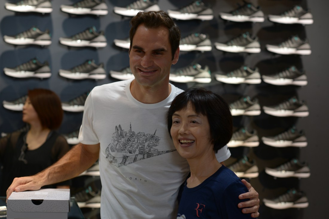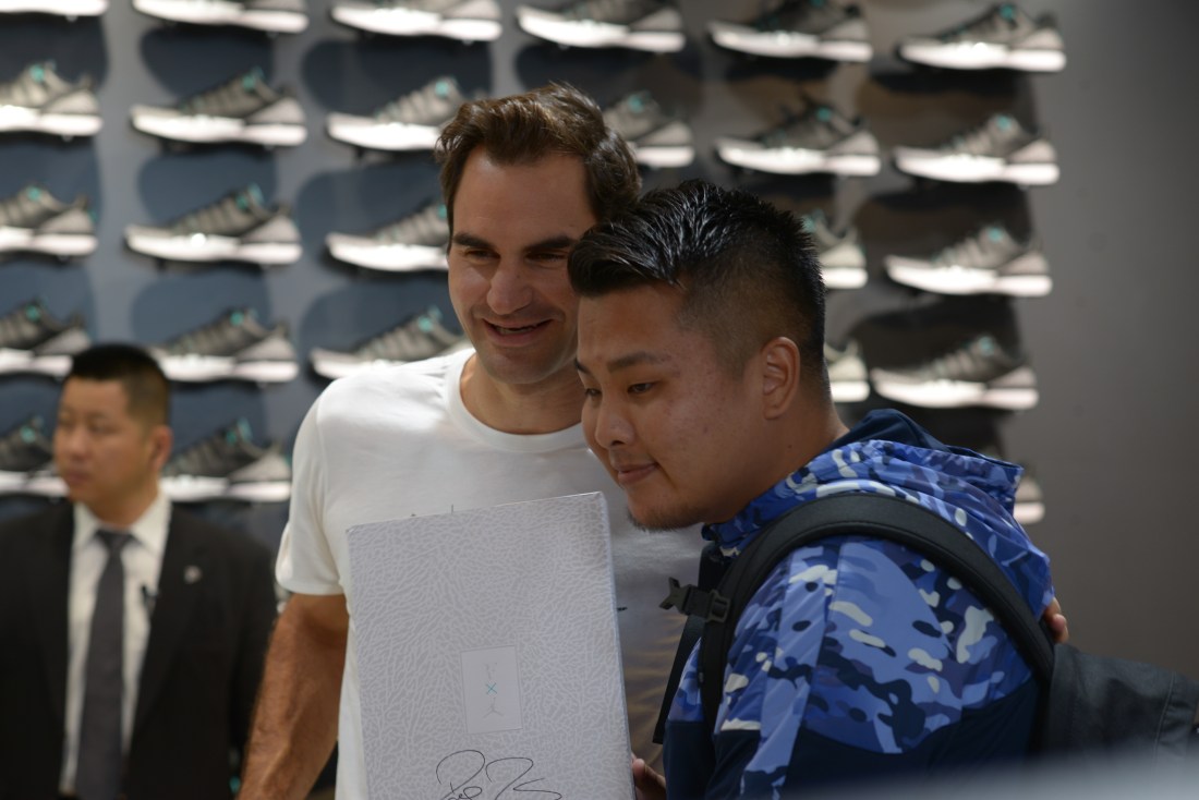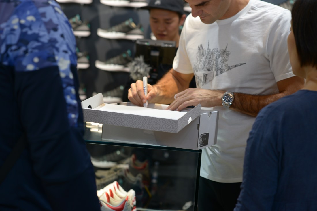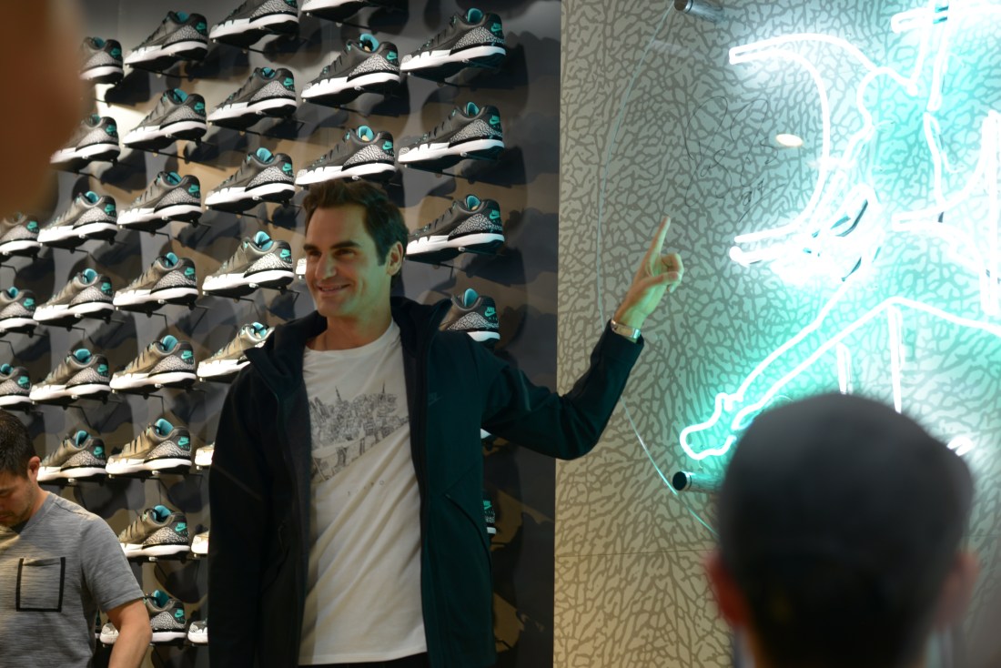 NikeCourt Zoom Vapor RF x AJ3 ‘Atmos’ 已於今日起 (10/5) 率先於東京開始販售,而 atmos 店內也特別以大型鞋牆展示此回雙方合作的新樣式,一字排開的氣勢十足震撼,稍早費爸 Roger Federer 更是親臨 Sports Lab by atmos 新宿店發售現場,並且為幸運被抽中入手的簽名留念。