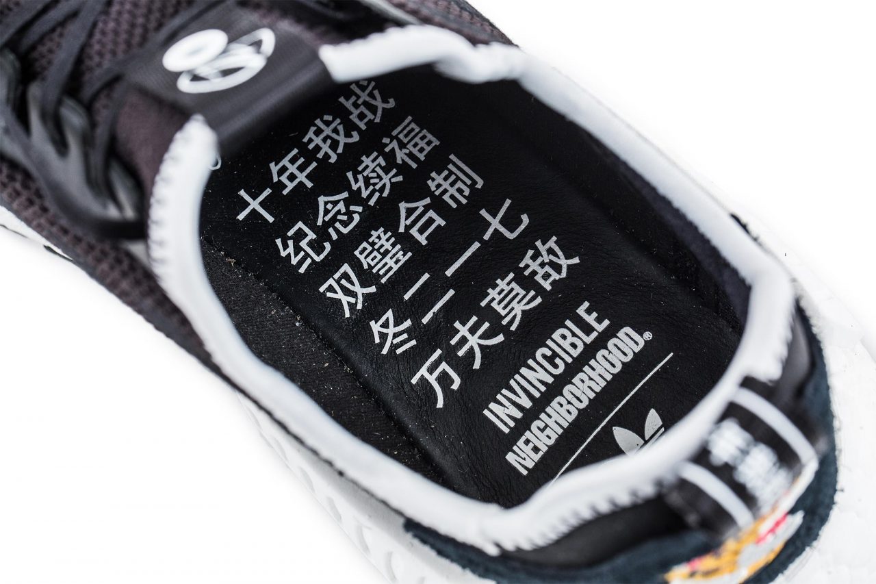 2017 年冬季,INVINCIBLE 迎來誕生十週年,本次特別與日本街頭品牌 NEIGHBORHOOD 進行聯名系列;作為雙方第一次的聯名,自然在整體系列的設計構想、靈魂概念都發揮到極致;鞋款方面更是與 adidas Consortium 展開三方合作,鞋型採用 NMD R1 加以改造,圍繞在 NBHD 向來在街頭上傳達的黑色為主軸,搭配上白色側邊穩定設計呼應 Boost 的科技裝置,並於兩腳前緣分別印有NEIGHBORHOOD & INVINCIBLE Logo。