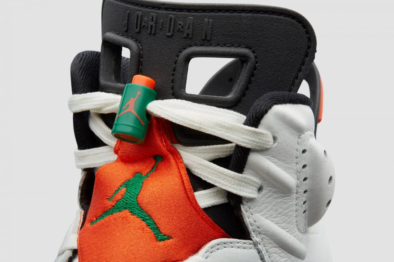 此次的 Air Jordan VI “Like Mike”,除了在配色上採用了 Gatorade 經典的橘、綠雙色,更在鞋帶鎖扣及鞋墊上呈現其經典的閃電元素。