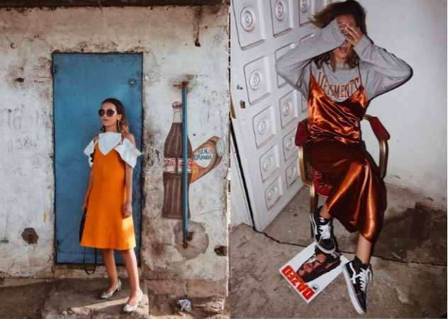 之前大家應該有看很多韓國歐膩把細肩帶洋裝內搭上衣或背心的吧!沒想到歐美人穿起來一樣合適,而且她內搭的選擇是白色的一字領上衣加上黃色洋裝很有春天的繽紛感。旁邊的則是以金屬色洋裝配上潮T,下面踩的還是vans,把潮流抓得穩穩的!