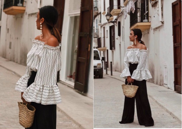 流行關鍵字:露肩、條紋、造型袖、闊腿褲、大耳環、藤編包