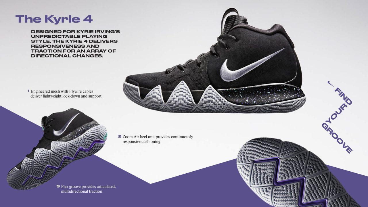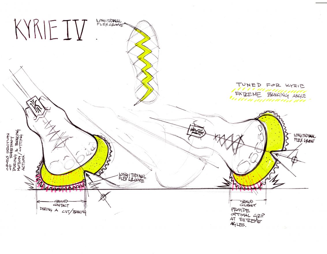 Kyrie Irving 擅長用大幅度且快速的變向迷惑防守者,在過人時雙腳可能會與地面形成誇張角度,因此他的球鞋需要高度穩定支撐與出色抓地力,「我需要一個支撐點,能夠施力做出動作又不失去平衡,變換方向時無論腳的哪個部位接觸地板都要在鞋內維持平衡,這點至關重要」Irving 說道。KYRIE 4 外底中軸有著一道 Z 字型溝槽,有效強化反應性及抓地效果。