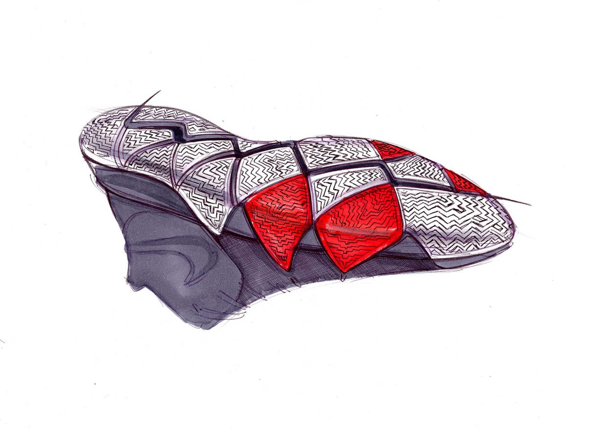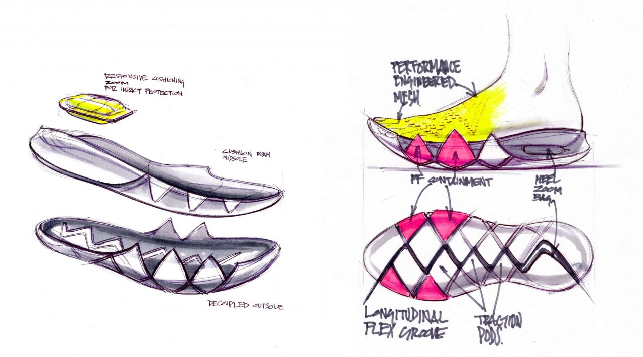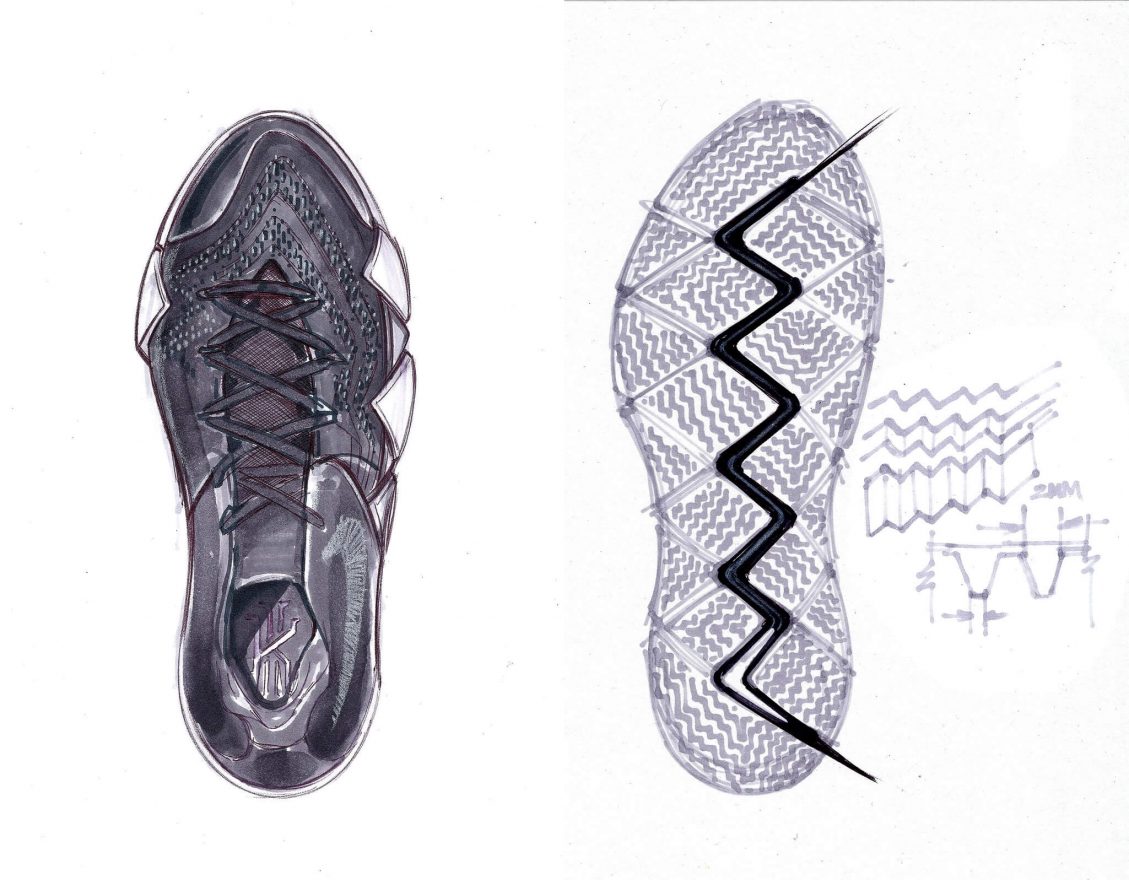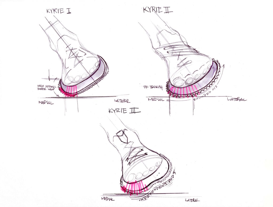 球鞋開發向來以「與雙腳適應」為核心,Nike KYRIE 系列的基礎就在於 Kyrie Irving 的球風,他對於性能有著相當獨特且具體的訴求,從 1~3 代設計圖中我們可以觀察到針對外底弧度、觸地面積的變化,其戰靴逐代演進持續匹配他犀利的切入能力,而這對 Benjamin Nethongkome 來說是很好的挑戰。