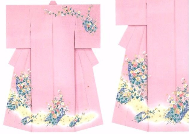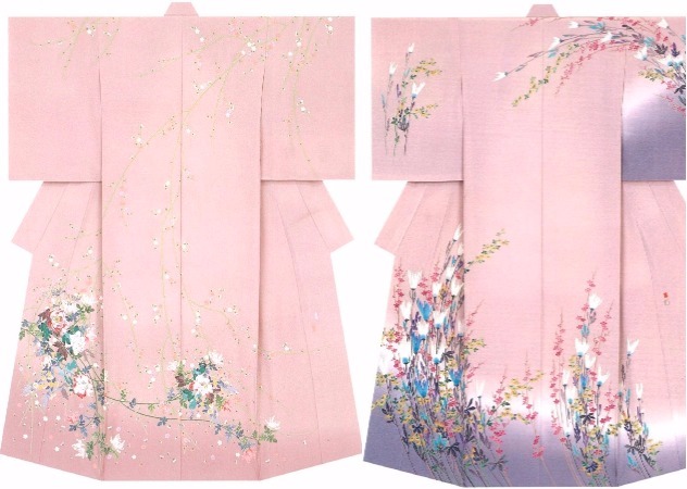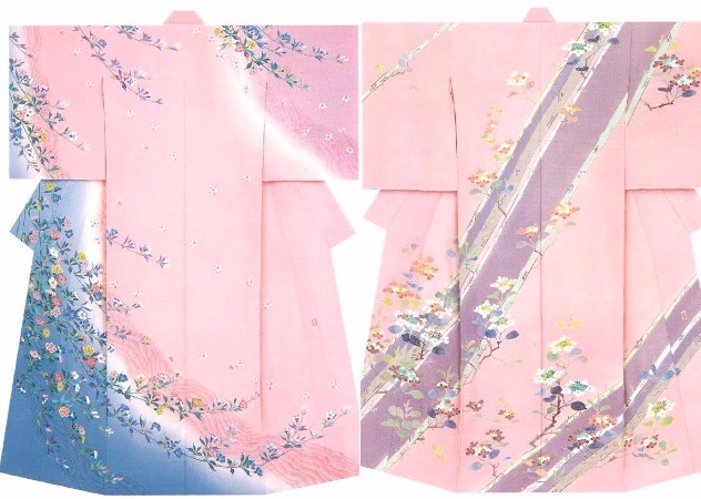 這種粉色的櫻花和服,是日本最具傳統代表性的染布技法,友禪染。友禪一詞最初是指宮崎友禪齋將扇繪應用在染布上色所發展出的獨特形式,是以澱粉質的防染劑,手繪染色的方法,經長時間的傳承與變化,漸漸發展出多樣的染色技法與風格。