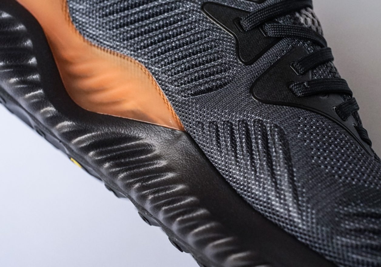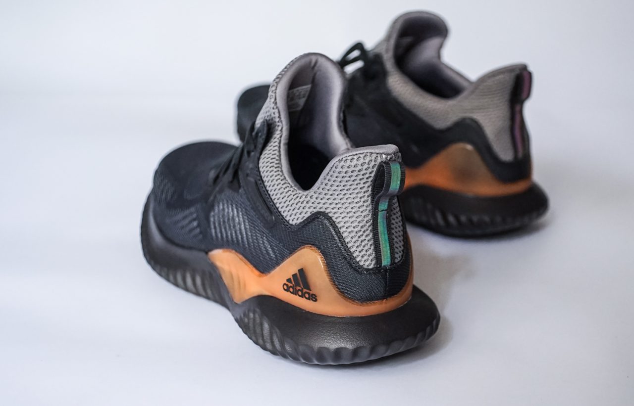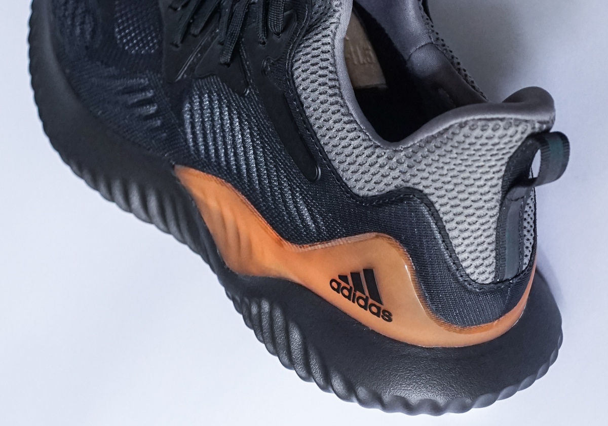AlphaBOUNCE 在初代發表時提過是對應慢跑與綜合訓練的鞋款,延續 BOUNCE 的軟 Q 特性,中底是彈性係數高發泡材,體積幾乎是一般鞋款的 1 又 1/4 大,朝地面向下向後延展的尾翼、邊緣的金牛角螺旋紋,聯想到 80 年代跑鞋 MARATHON TR 後跟;中底特別加長加寬,搭配像是上下結構一夾起來滿滿溢出的花生醬之穩定片,這是 adidas 機能鞋款長年以來提供穩定性的大功臣後跟門神 Fitcounter。