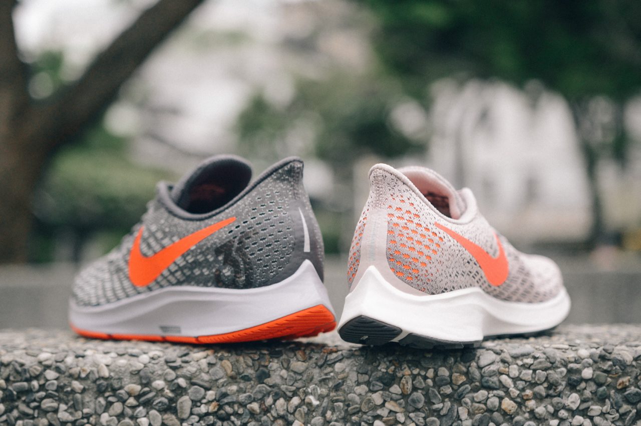 在 Breaking2 計劃之後,Nike 許多鞋款開始傳承 Nike Zoom Vaporfly Elite 的精神,Nike Zoom Vaporfly 4%、Nike Zoom Fly、Nike Vapor Street Flyknit 的共通點正是那迷人的屁股,後跟尖錐設計是在向後抬腳準備推進過程中減少空氣阻力,減低能量消耗,同時提供動態支點提供更滑順的觸地節奏,Nike Air Zoom Pegasus 35 除了中底後跟受注目外,Zoom Air 氣墊也相當創新,受到 Nike Zoom Vaporfly 4% 跑鞋中獨特形狀的碳板起發,將 Zoom Air 彎曲當作兼當支撐片使用(為了證明氣墊可以彎曲,設計師還把氣墊放進微波爐加熱,彎曲程度可包住一個啤酒杯),實際試穿起來能感受這次 Cushlon 中底配方中柔軟帶有些微 Zoom Air 回饋(女版不同中底調配吸震力更強),不過版型比較偏窄,相較於先前 Nike Air Zoom Pegasus 有所變革,建議還是試穿過為佳。