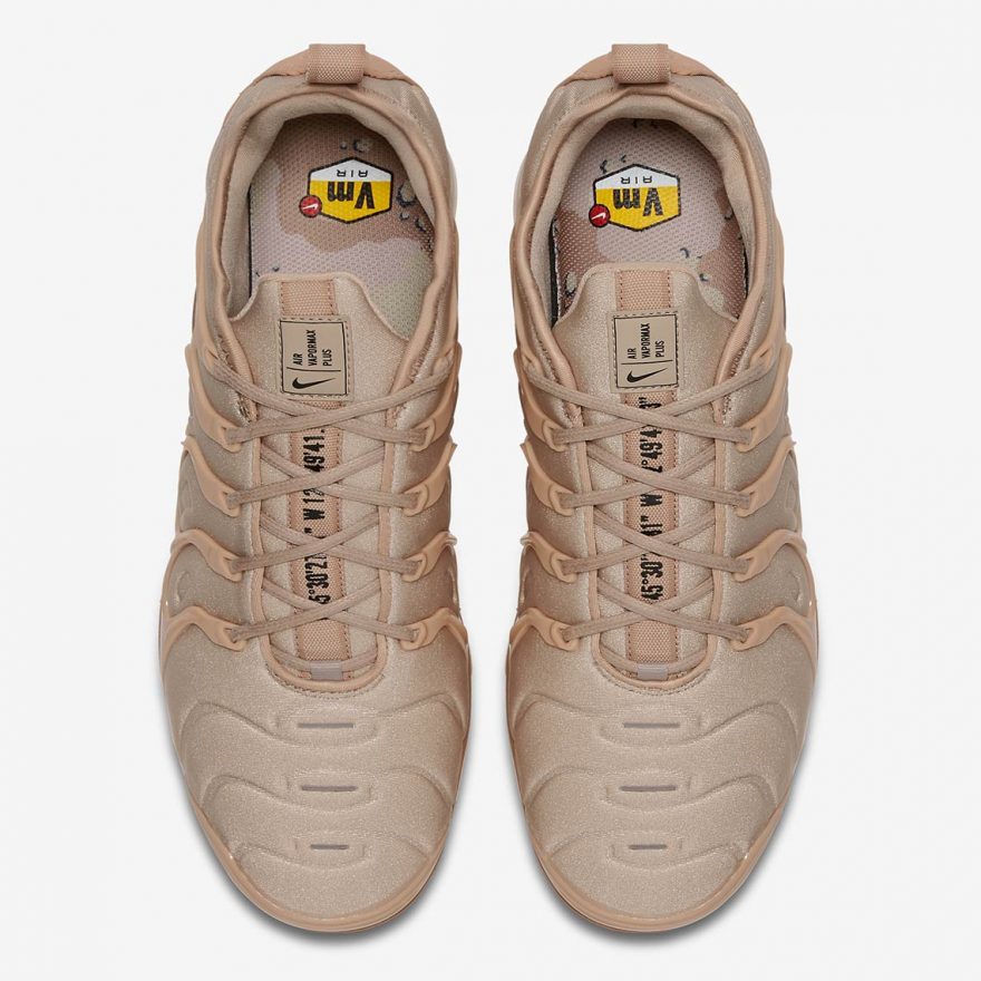 Nike Air Max 1 直接用沙漠迷彩的圖樣覆蓋了整個鞋身,主題十分清楚明瞭。兩側 Nike Swoosh 則用上了類似麂皮的材質,與鞋標、鞋帶相呼應,鞋底用上咖啡色膠底,使整雙鞋硬派到不行,存在感相當強烈。而 Nike Air VaporMax Plus 鞋身使用類似潛水衣的彈性面料,搭配相異材質堆疊並以棕色貫穿,而若沒有看到鞋底及鞋墊的話,還真不會發現這雙是所謂的沙漠迷彩,低調展現的隱藏版細節顯示與 Nike Air Max 1 師出同門。此外仔細看還會發現,鞋底與氣墊接合處的圖案也有沙漠迷彩塗裝呼應主題,十分細膩。