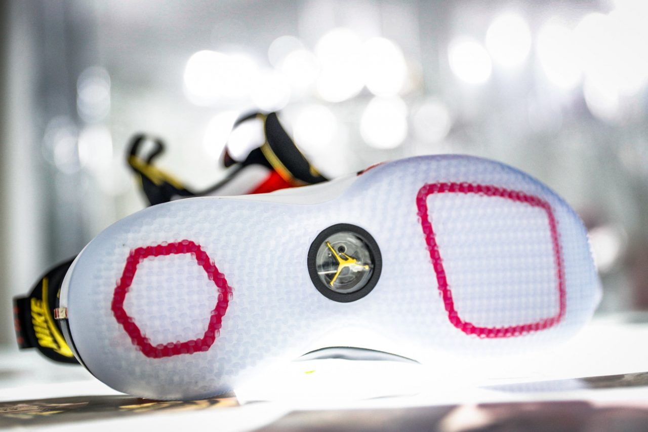 現場進行產品解說的工作人員也特別提到,Air Jordan XXXIII 特別把此次科技核心 – FastFit 系統的轉盤顯露於大底,不只有種錶盤般的機械工藝美感,更是為了紀念 Tinker Hatfield 當年在 Air Jordan 3 後跟劃開一道窗,把可見式氣墊帶入飛人家族的重要經歷。過去我總喜歡把氣墊對著燈享受光穿過透明殼層的迷人模樣,這次拿到 Air Jordan XXXIII 則是不自覺一直翻到鞋底盯著喀喀作響的轉盤運作著,一樣的浪漫。