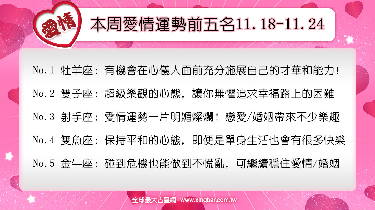 本周依然是水逆的高峰期,請想談戀愛、想把戀愛談好的同學,畫好重點:「無奈的情況影響心情,人際之間容易鬧不愉快」。這意味著,出了問題要溝通,但溝通卻不一定有效的情況會讓你頭禿!這折騰人不償命的水逆,感覺血槽已空……摘星工廠-星吧(11.18-11.24)愛情運幫你「回血」,請準時接收能量包!本周愛情運勢前五名:牡羊座、雙子座、射手座、雙魚座、金牛座。(請參考太陽及上升星座)