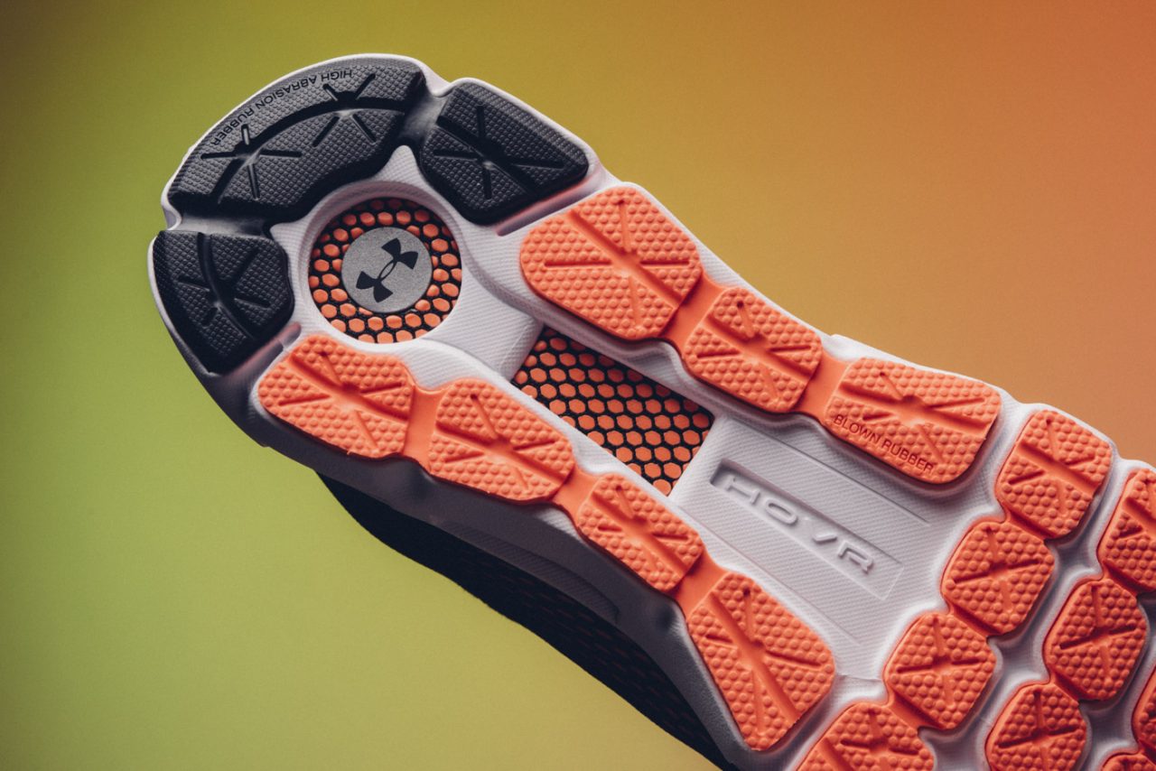 外底部份在後跟容易磨耗區域使用含碳量高的橡膠 (黑色),中、前掌則是發泡橡膠 (Blown Rubber) 具備良好彈性能作為起腳時的推進能量,同時 Under Armour 把橡膠分割成塊狀結構,讓外底能輕鬆隨著腳掌彎曲幅度形變,保持跑步流暢度。