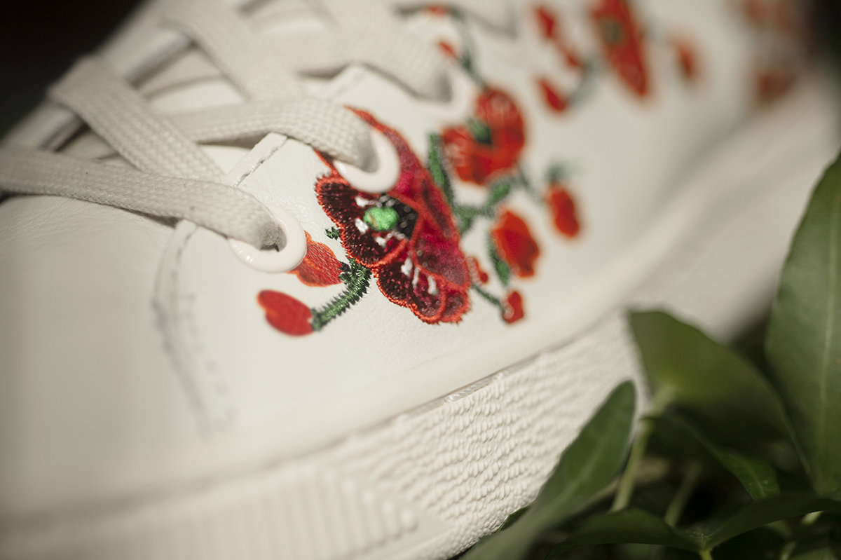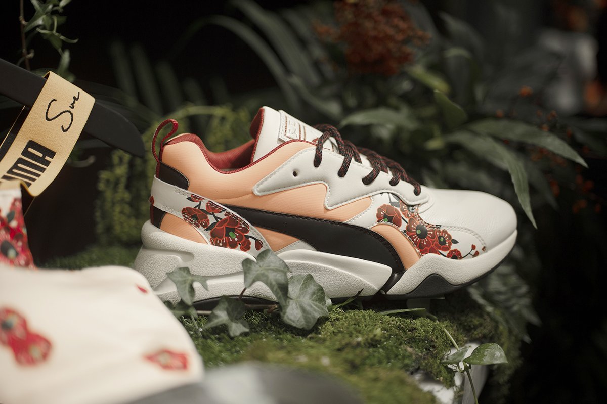 RED 芮德:很大自然,蠻意外一位紐約藝術家會有如此貼近自然的設計,畢竟紐約的市容不是這樣,另外可能是華裔背景所以有罌粟花、蓮花設計,還有火箭這種爆破感設計。我自己也是喜歡買鞋,加上我跳舞背景所以有不少 PUMA Suede,非常符合街頭風格 (婁峻碩 SHOU:她家門口就有二十雙鞋,大概一半以上都 PUMA)。