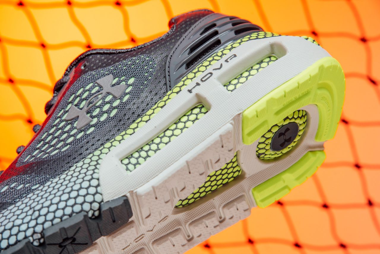 UA HOVR 能有快速反應的關鍵在於外層包覆的網狀結構,控制受力後的最大變形量並即刻回彈,同時保有內層原本強大緩衝機能,造就 UA HOVR 兼具天平兩端性能的優勢,不過上面文章不斷強調 HOVR MEGA 厚底設計到底有多厚?前掌 24mm 後跟 32mm 或許沒什麼概念,如果換個說法 HOVR MEGA 最薄的前掌比 HOVR Velociti 2(輕量反應取向跑鞋)最厚的後跟還要高,這就有概念了。第二個 HOVR MEGA 特色是中底外層的發泡材結構,其他成員都會用整圈籠式結構包住來提升反應性,例如 HOVR Infinite 前掌中底高,不過因為多一層發泡材實際穿起來潰縮程度並不大,但 HOVR MEGA 就不同了,大面積外露 HOVR 是跑鞋中最多的,僅於後跟崁入一塊 Charged Foam 材料,有效穩定落地時受衝擊的變形,排除中底不穩的疑慮,猶如鎧甲般讓每一步都安心。