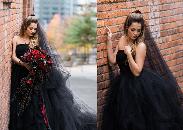 黑色婚紗以層層薄紗堆疊而成,澎澎的裙襬勾勒華麗復古的形象,輕掩在禮服外的薄紗,有著黑色迷霧般的視覺效果,搭配同款頭紗包裹住新娘,強烈的戲劇效果拍攝起來別有一番迷人的姿態。