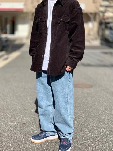 燈芯絨襯衫的另一種搭法,就是將扣子打開來當作外套式單品,內裡混搭簡單的素T,下身利用同色調的牛仔寬褲與球鞋,創造視覺的一體感,為沉悶的冬日穿搭增添風采。