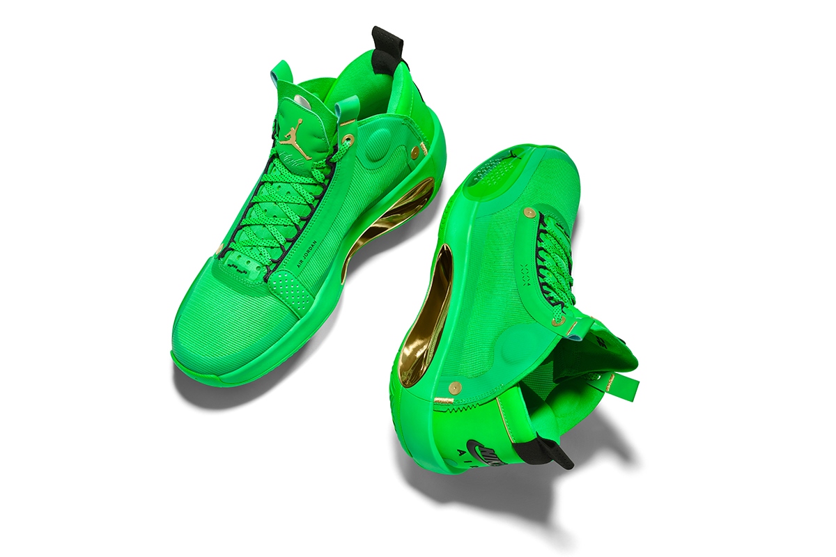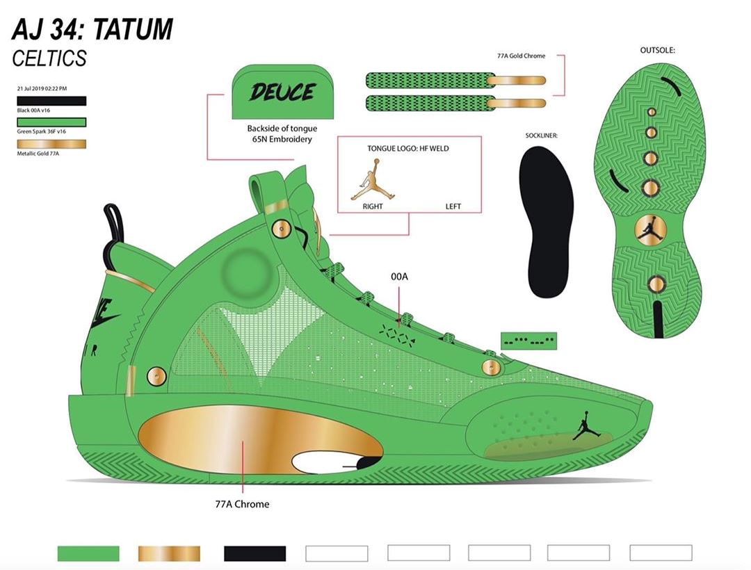 之前先是作客費城與 76 人進行第一場比賽後,塞爾提克隊今天回到主場開幕,今年夏天剛加入 Jordan Brand 的 Jayson Tatum 特別選在本場穿著 Air Jordan XXXIV PE 出賽,以球隊最具標誌性的顏色為主視覺搭配金屬色去裝飾,讓我想起 2005/06 – 2012/13 球季期間塞爾提克隊所使用的聖派翠克節(Saint Patrick’s Day) 紀念球衣,此外編輯覺得跟現行的 City Edition 球衣相搭應該也不賴,看看接下來穿 City Edition 的場次 Jayson Tatum 會不會再拿出來穿了。