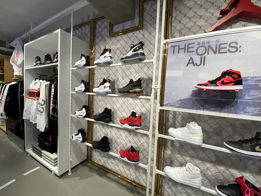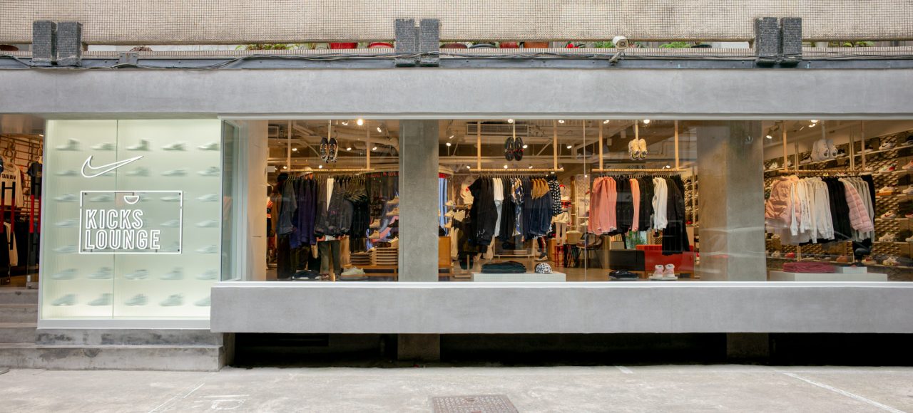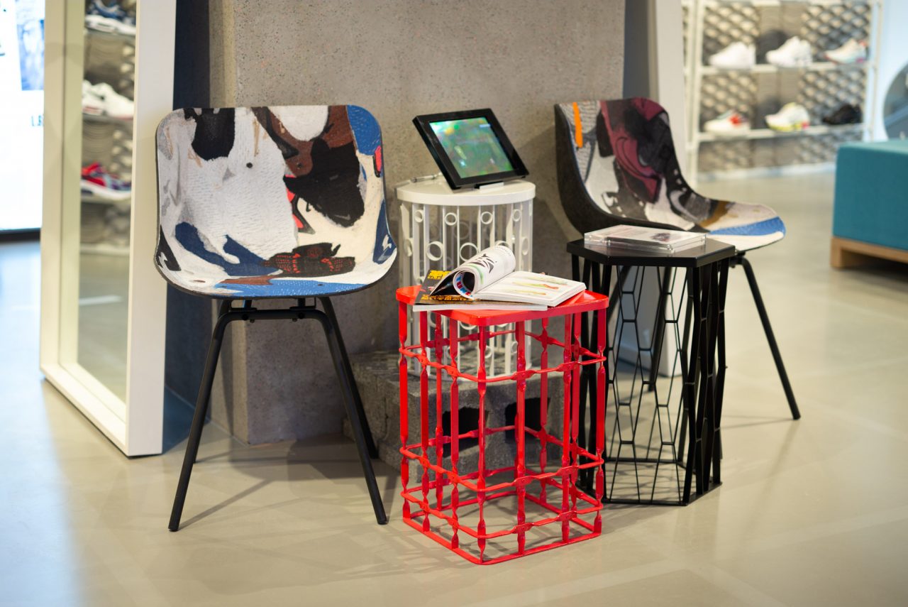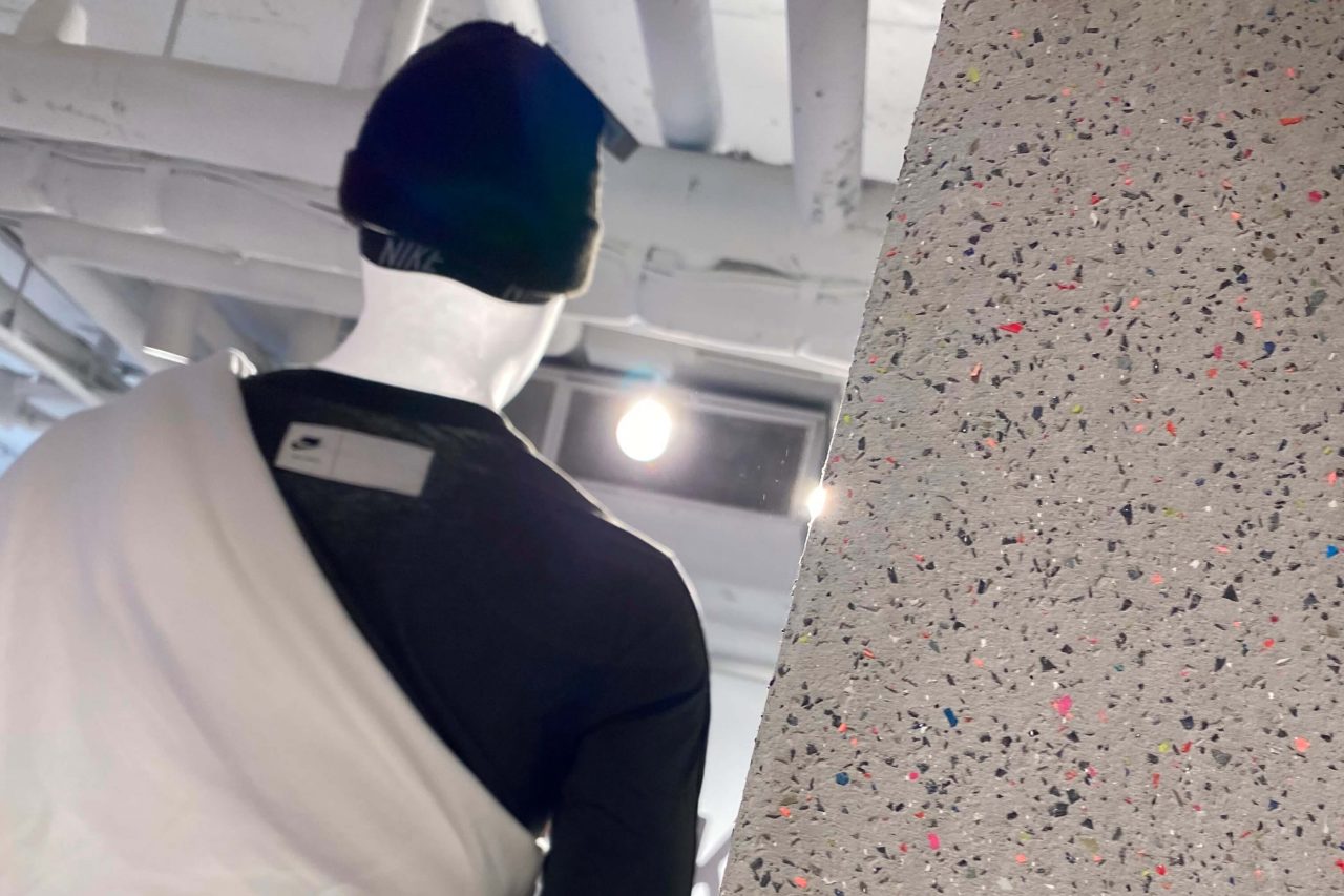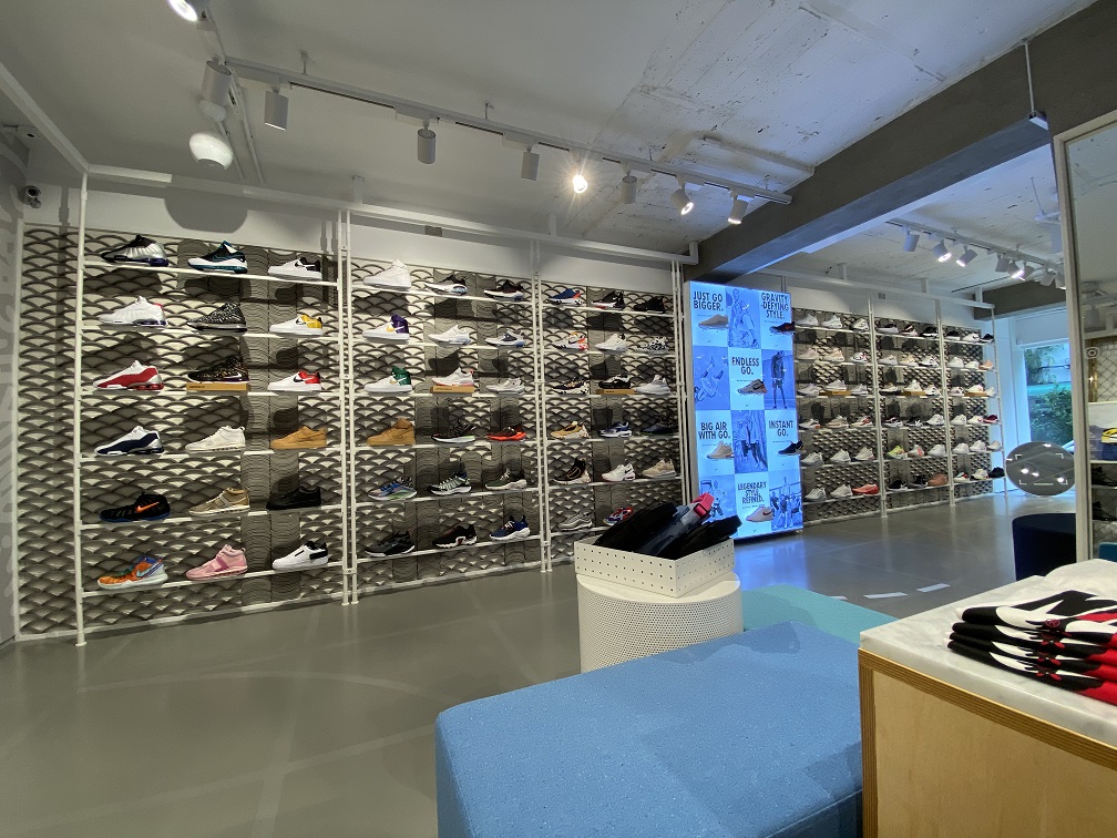 店點運用回收再生材質 – NIKE GRIND 建材打造,將回收球鞋與多餘生產的「廢料」重製成為「NIKE GRIND」再生材料顆粒,並於此原料中混入水泥砂漿。據悉 NIKE KICKS LOUNGE EAST 的再生裝潢建材共計用了約五萬只舊鞋,可說是名副其實的「鞋店」。而所有的家具織品更同樣採用 100% 回收再製品,並攜手同樣關注環保議題的設計師周裕穎,大量運用二手 NIKE 服飾及配件改造二手家具,融入台灣老宅鐵窗花概,透過創意賦予舊物新生命。