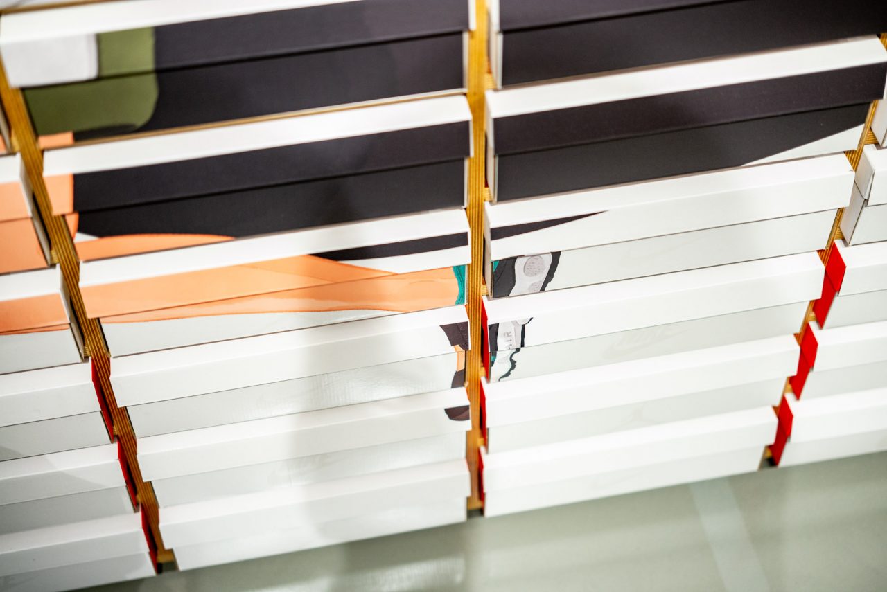 勘履者有注意到嗎?這面塗鴉牆其實是由一個個鞋盒堆疊組成超大畫布,再由藝術家彩繪上巨幅畫作。