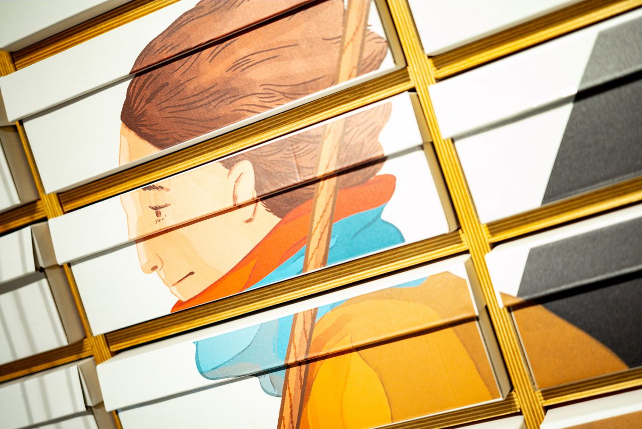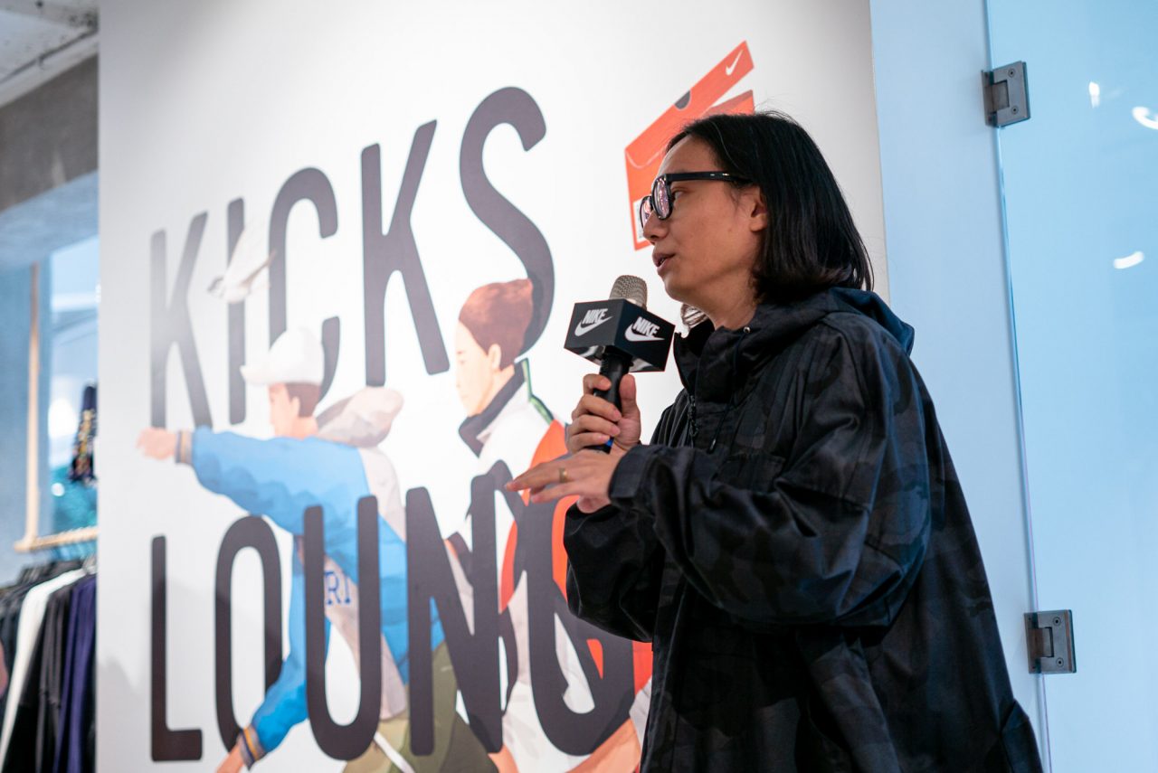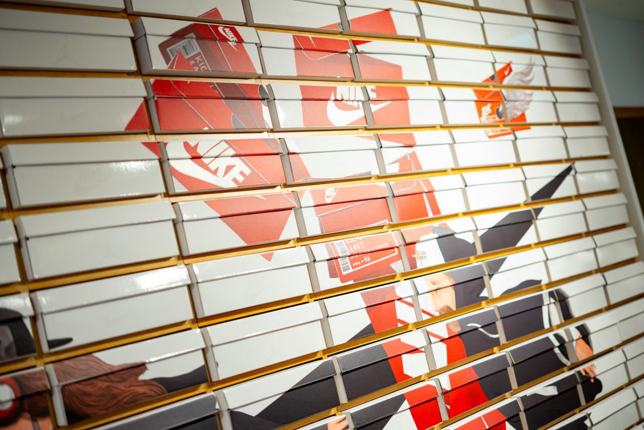 NIKE 邀請藝術家 ABEI 創作巨幅畫作,以繽紛奇幻的畫風,描繪出對街頭文化著迷的時髦「東區人」。ABEI 將鞋盒標籤設計變化為旗幟,讓每一位到訪的球鞋愛好者,都能藉此作品感受到凝聚台北東區人的熱鬧生命力,也象徵 NIKE KICKS LOUNGE EAST 插旗東區潮流重鎮的獨特意義。