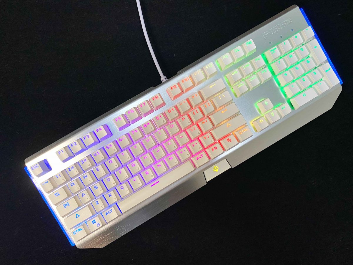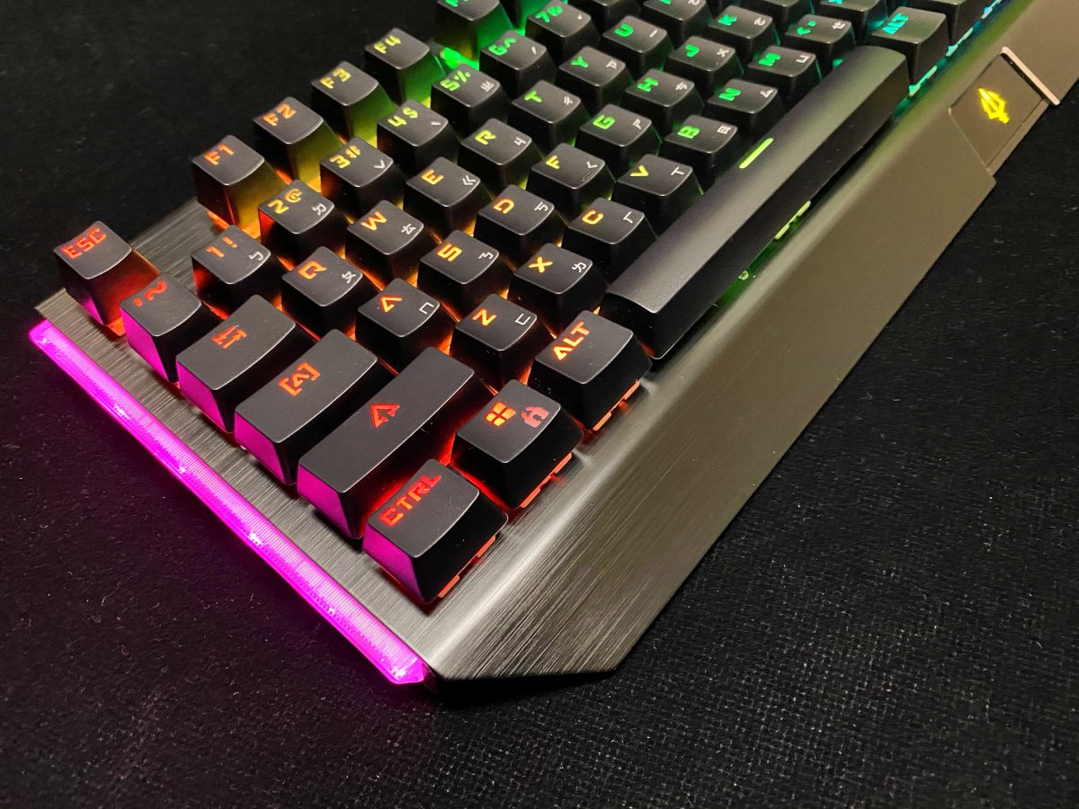 PJ01 機械軸採用 Outemu 高特青軸,清脆的段落手感與響亮的 Click 聲響,軸體本身為透明上蓋,並有著 RGB LED 燈珠點亮鍵帽,而在鍵盤兩側則有七種顏色的燈條可以做調整。除了可以到官網上下載驅動程式編輯燈光特效以外,也可依照使用說明書中的快捷鍵進行更改。