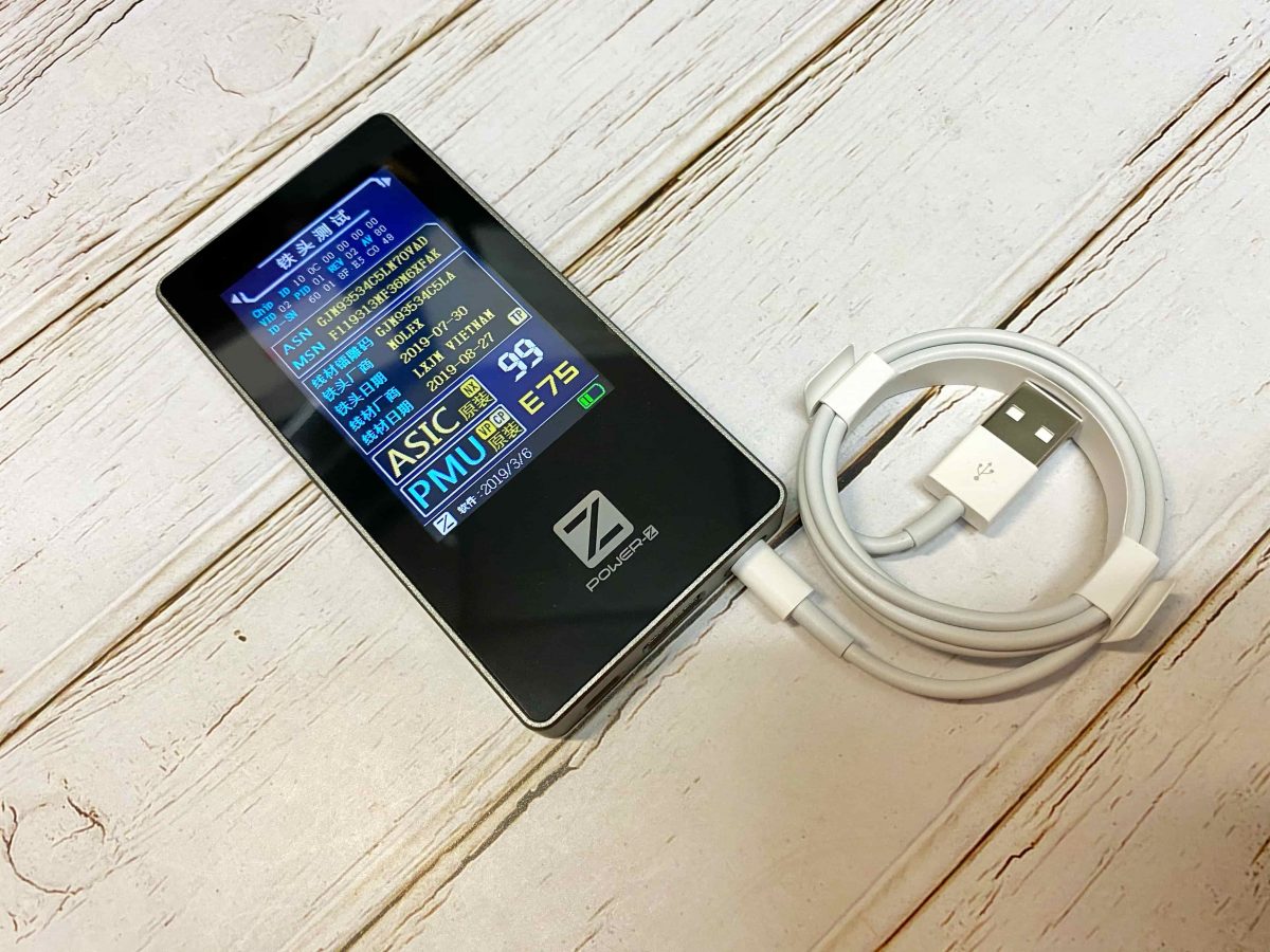 蘋果今年採取特殊的做法,僅在兩款高階系列的 iPhone 11 Pro、iPhone 11 Pro Max 上附贈快充配件。而筆者購買的是 iPhone 11,隨盒附贈的是使用好幾年的 5V1A 充電組。經由晶片檢測儀器 POWER-Z MF001 測試後可以看到為原廠代號 E75 的 Lightning 晶片。( 這條原廠附贈的 USB-A to Lightning 無法啟動快充,最高僅支援 5V2.4A )