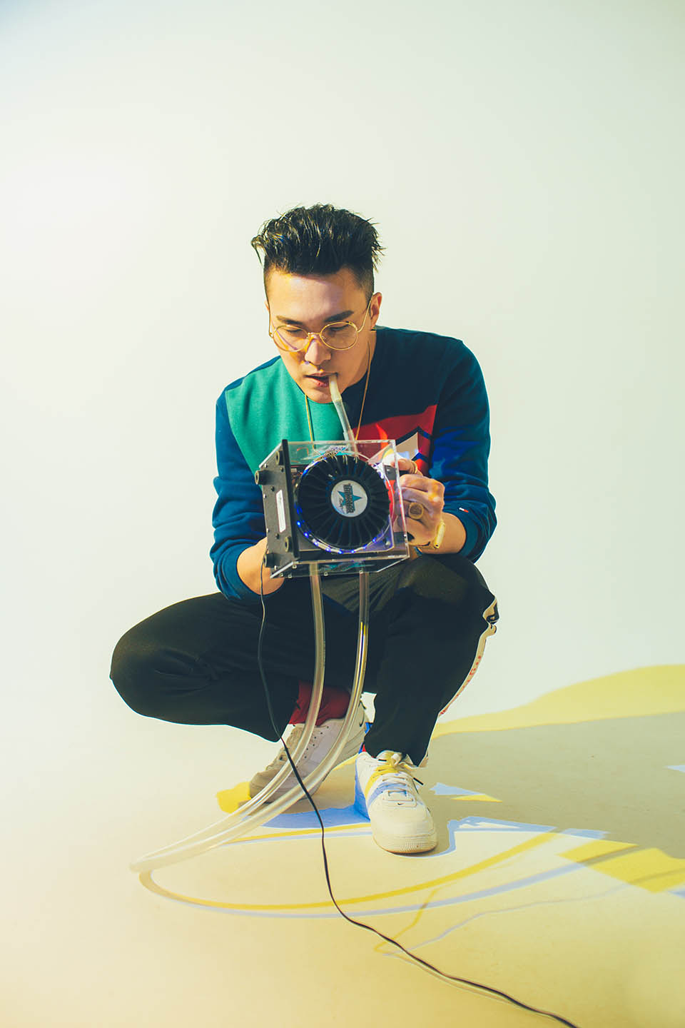 SJIN 從小學鋼琴而接觸古典樂,2008 年與呂士軒、張伍合組 SmashRegz/違法,負責編曲與 Talk Box。「音色就像時尚界的色調,會有流行的Tone調。音樂有很多套路,我希望翻新舊有元素,帶聽眾去不同的地方。」經呂士軒提議,他開始自學摸索 Talk Box,此後表演說話盒的 SJIN 成為 Live 現場的奇特存在。「就像講悄悄話,Talk Box 只要改變嘴型就能替代喉嚨發出音高,具絕對音準,重感冒一樣可以唱。」