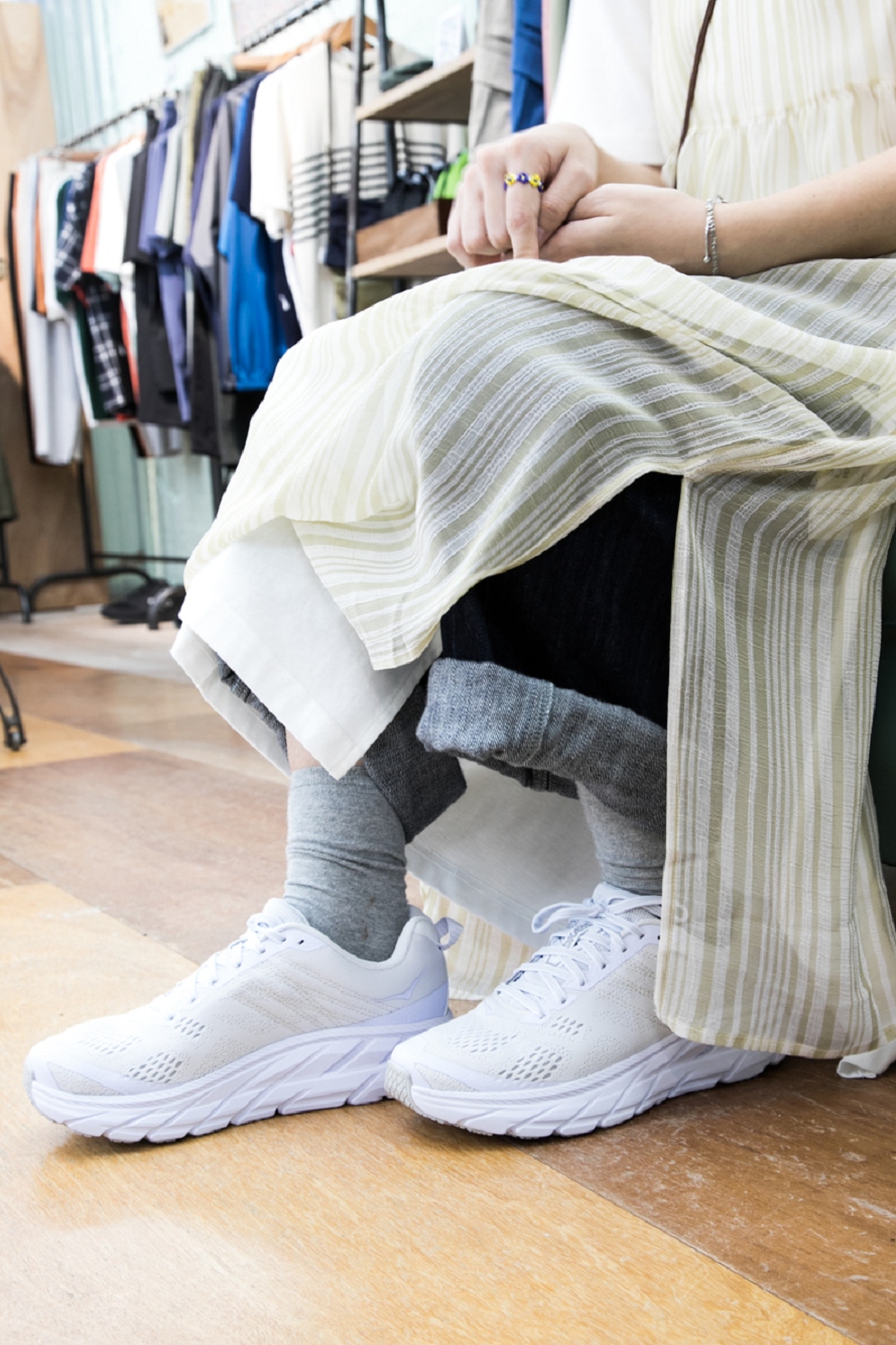 不論是折起的褲腳或是腳上襪款的色彩,灰色調確實是能顯白並不會過度對比,讓優雅氣質從頭到腳都能散發出來,挑脫 Hoka One One 機能本質的強硬觀感,女生方面用不同以往的唯美風格詮釋,讓人對 Hoka One One 有更多想像空間。