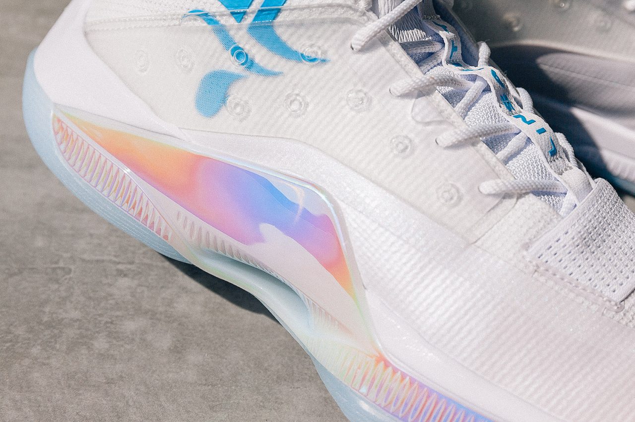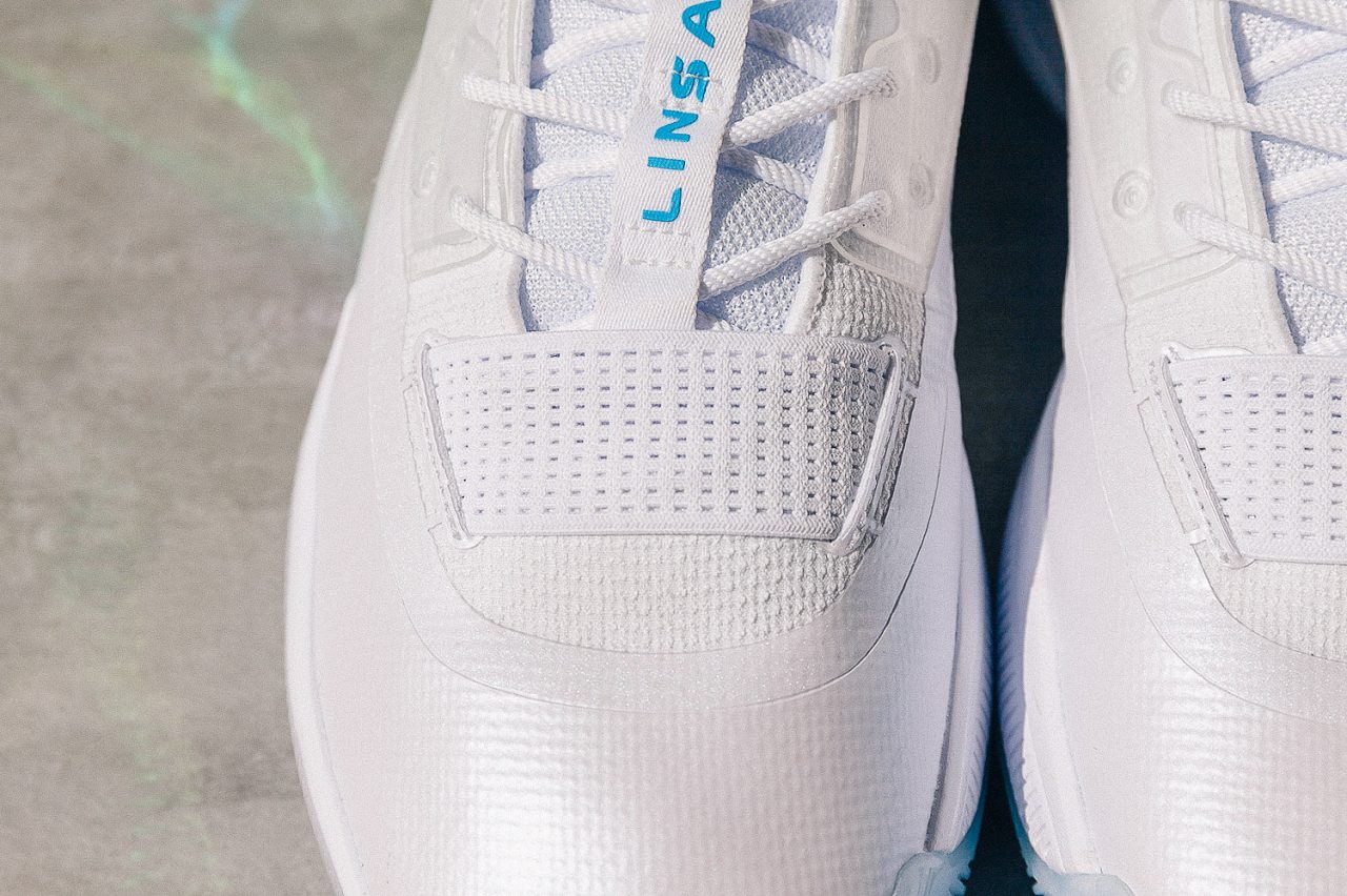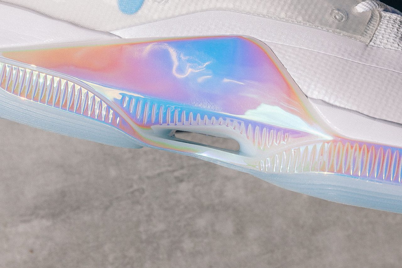拿到鞋子你能感受到游雲 IV 在保護方面下的苦功,鞋領一圈填充不說,光是鞋面就用韌性較強的織布為主體,加上鞋頭延伸至鞋身邊緣複合式PP 膜,以及中段的透明塑料支撐片,雖然鞋面厚度是足以透光,但對於透氣表現仍保有疑問。游雲 IV 有著明確的設計語言,彩虹鍍膜出現在鞋側、大底和拉環,而林書豪的部份則用藍色立體膠印來呈現,加上支撐片與大底的半透明感,讓整體傳達出一致清新視覺。