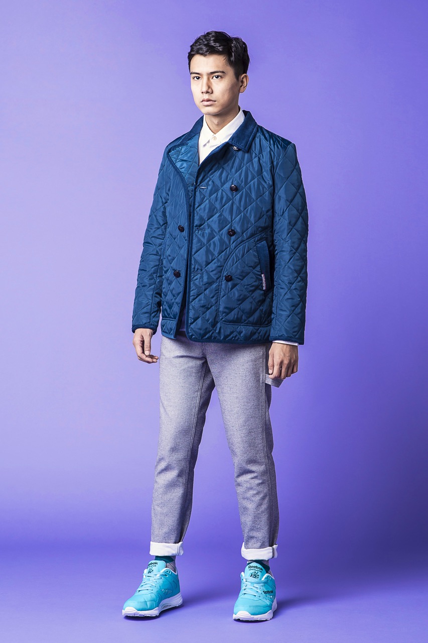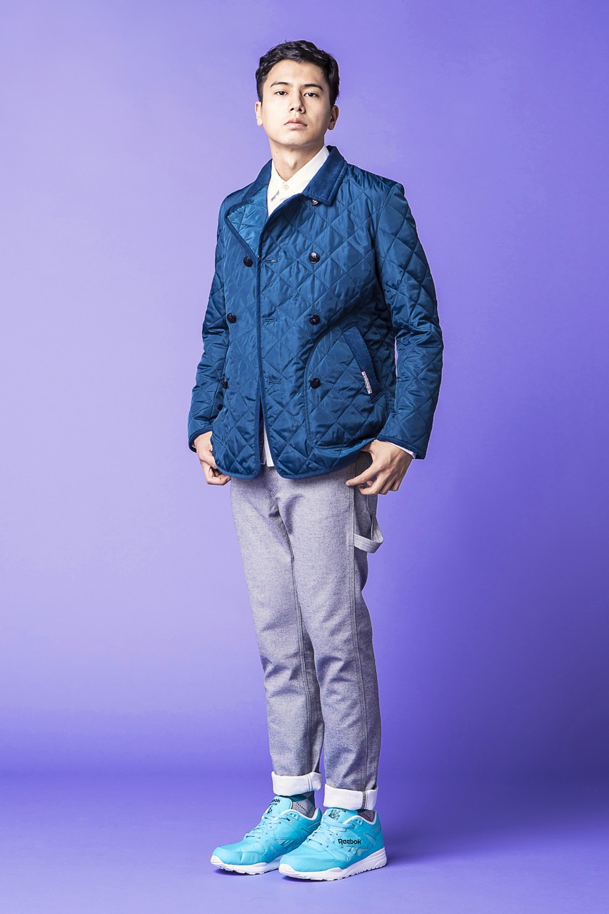 在本回的造型提案中,Shao 選擇最貼近 HeavyUse 形象的 Reebok Ventilator “Neon Blue” 配色,上身以土耳其藍的 Quilting Pea jacket,以縫線交織出的立體菱格紋與俐落的版型剪裁營造出強烈的古著氣息,下身則選擇修身窄版的工作褲,加上褲管 Pinroll 的造型技巧,也更突顯出 Reebok Ventilator 的經典輪廓與存在感。(外套 $3,580;襯衫 $2,080;工作褲 $3,380(以上產品皆為 HeavyUse select,詳情請洽HeavyUse Oasis);Reebok Ventilator OG $2,650)